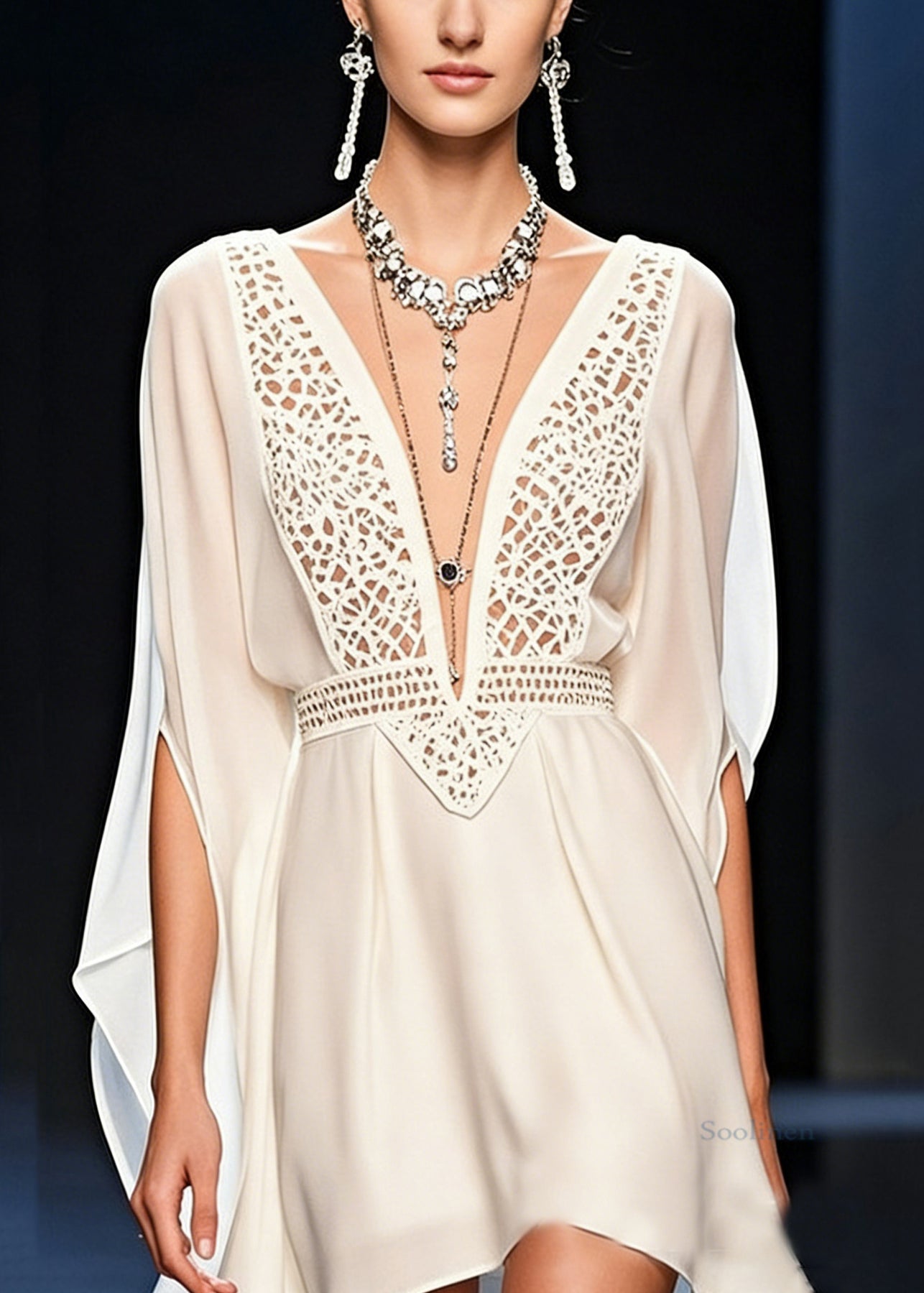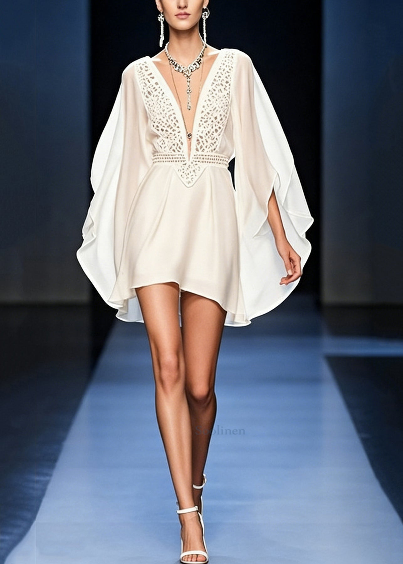 Italian White V Neck Hollow Out Chiffon Mid Dress Batwing Sleeve