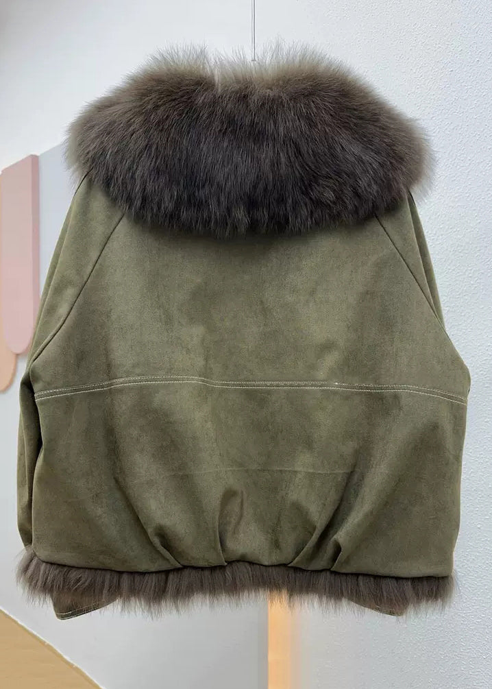 Loose Army Green Fur Collar Patchwork Fine Cotton Winter Coats Winter