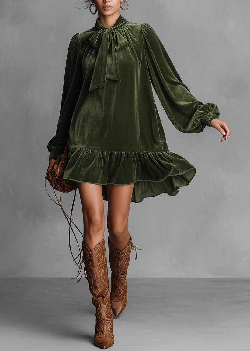 Loose Green Bow Wrinkled Solid Silk Velvet Mid Dress Spring