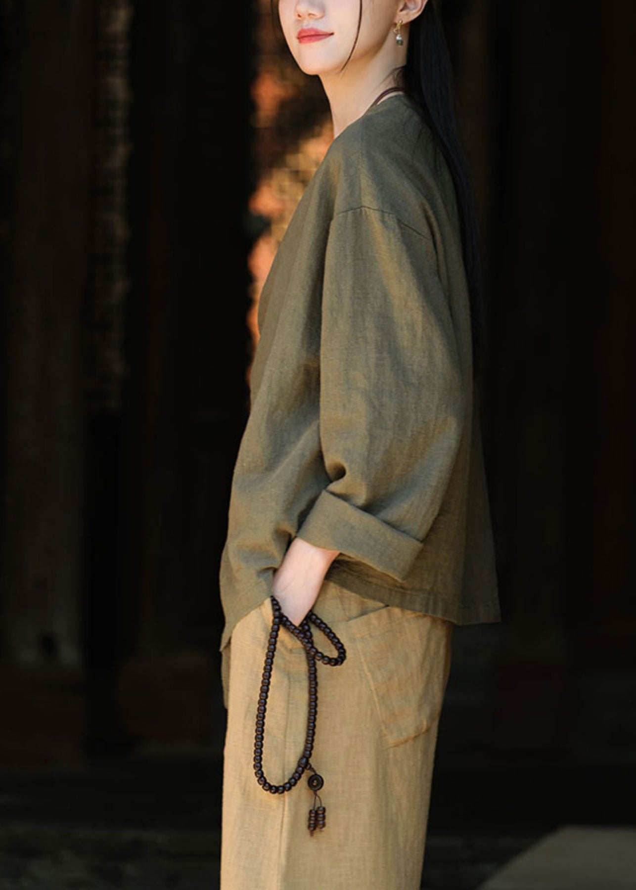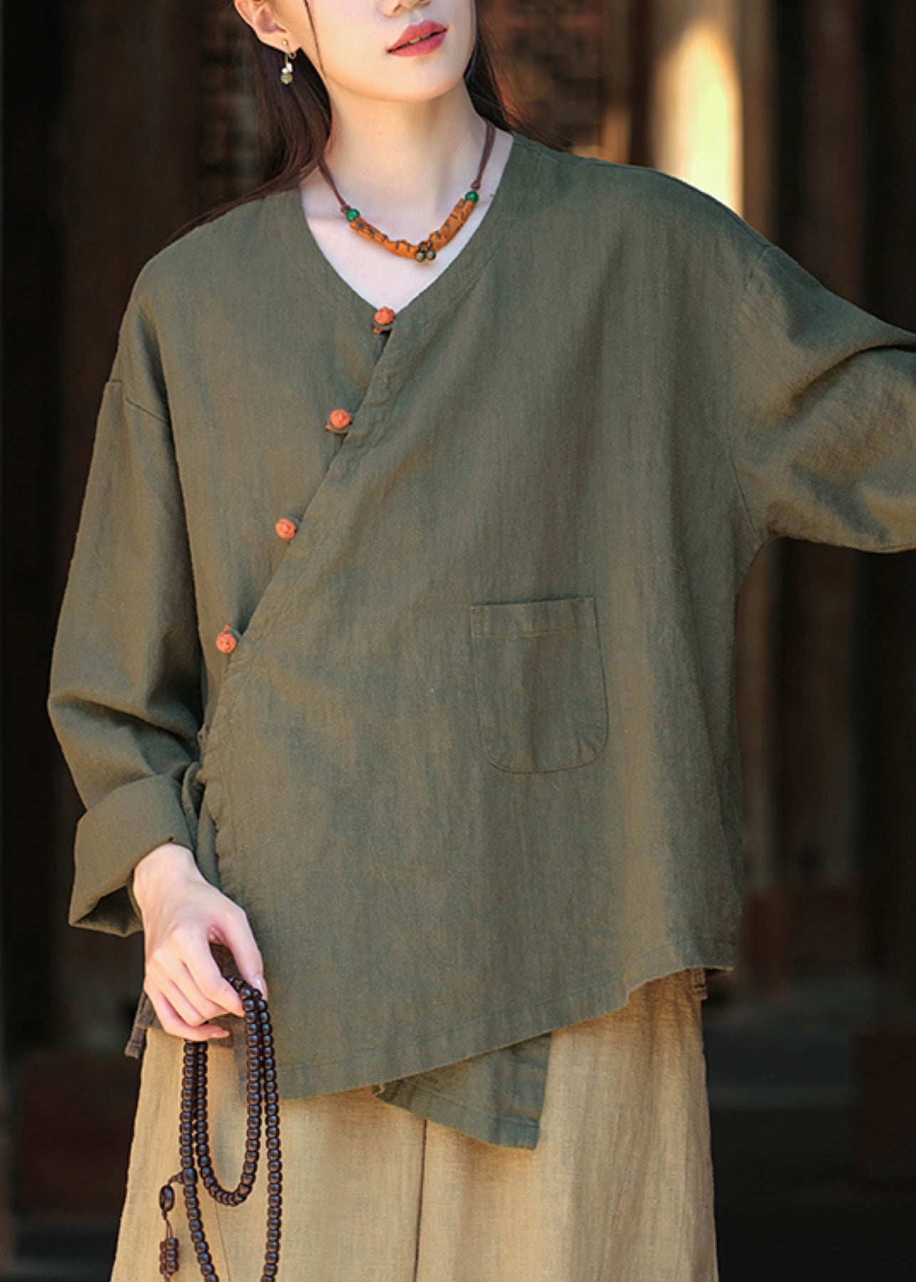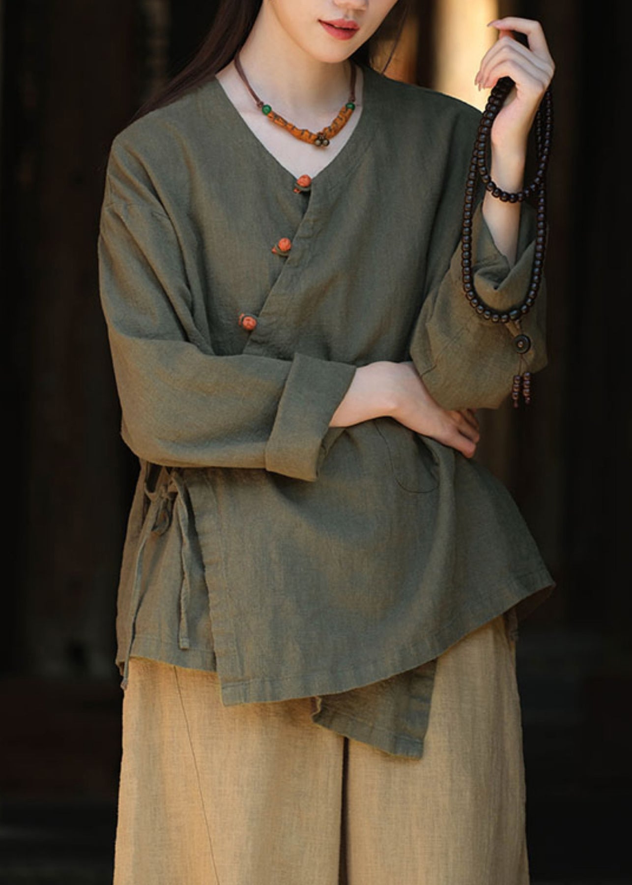 Women Green V Neck Button Lace Up Cotton Shirts Fall