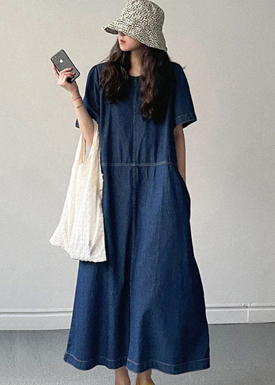 Light Blue Pockets High Waist Denim Long Dresses O Neck