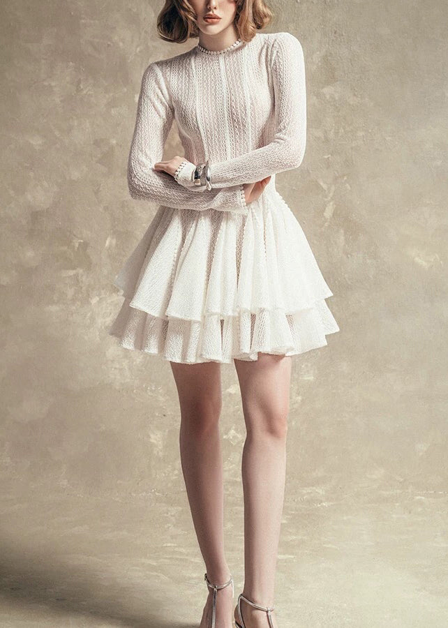 French Slim Fit Black O Neck Wrinkled Lace Mid Dress Spring