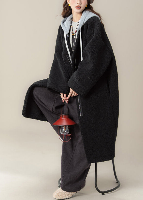 Plus Size Black Hooded Zippered Patchwork Teddy Faux Fur Coat Winter