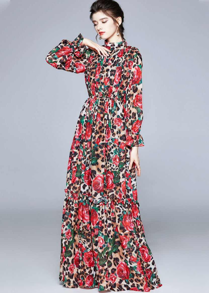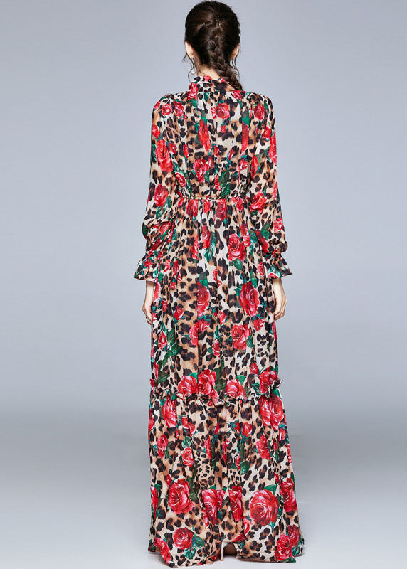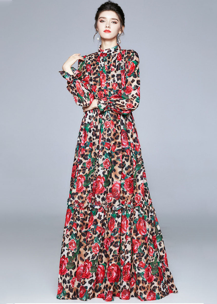 French Red Stand Collar Ruffled Leopard Print Chiffon Long Dress Fall
