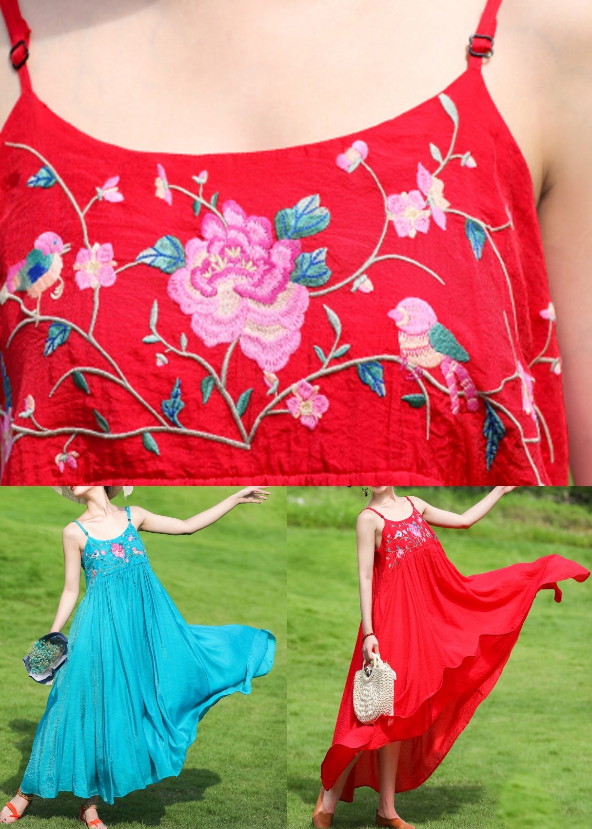 Red Wrinkled Patchwork Cotton Spaghetti Strap Dress Embroideried Sleeveless