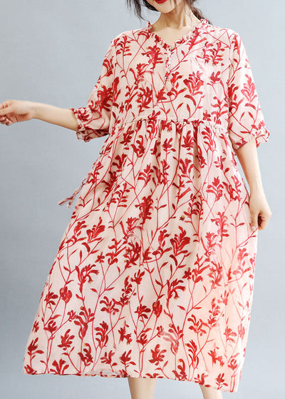DIY Red Ruffled Print Linen Holiday Dress Half Sleeve