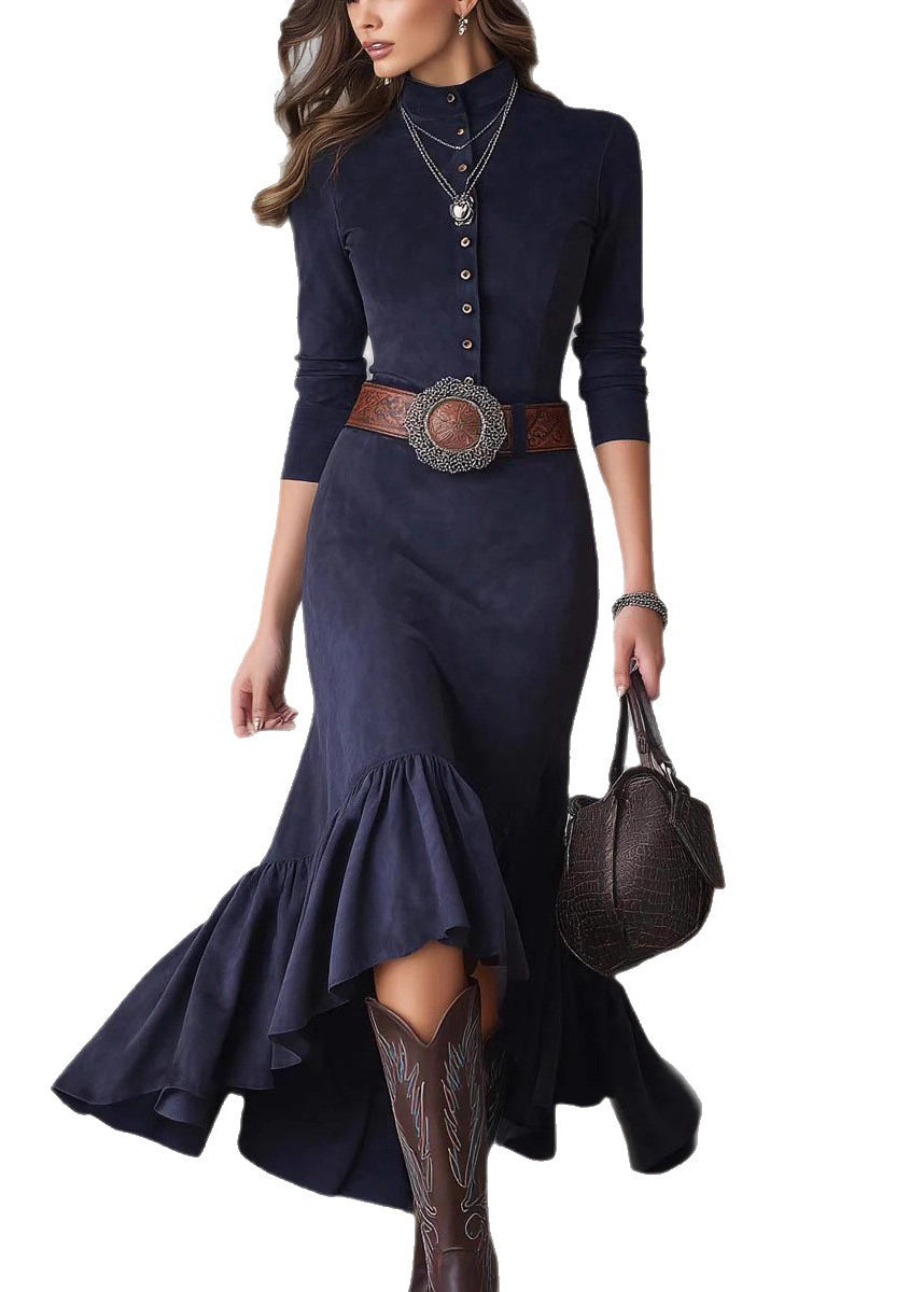 French Navy Wrinkled Button Solid Faux Suede Long Dress Spring