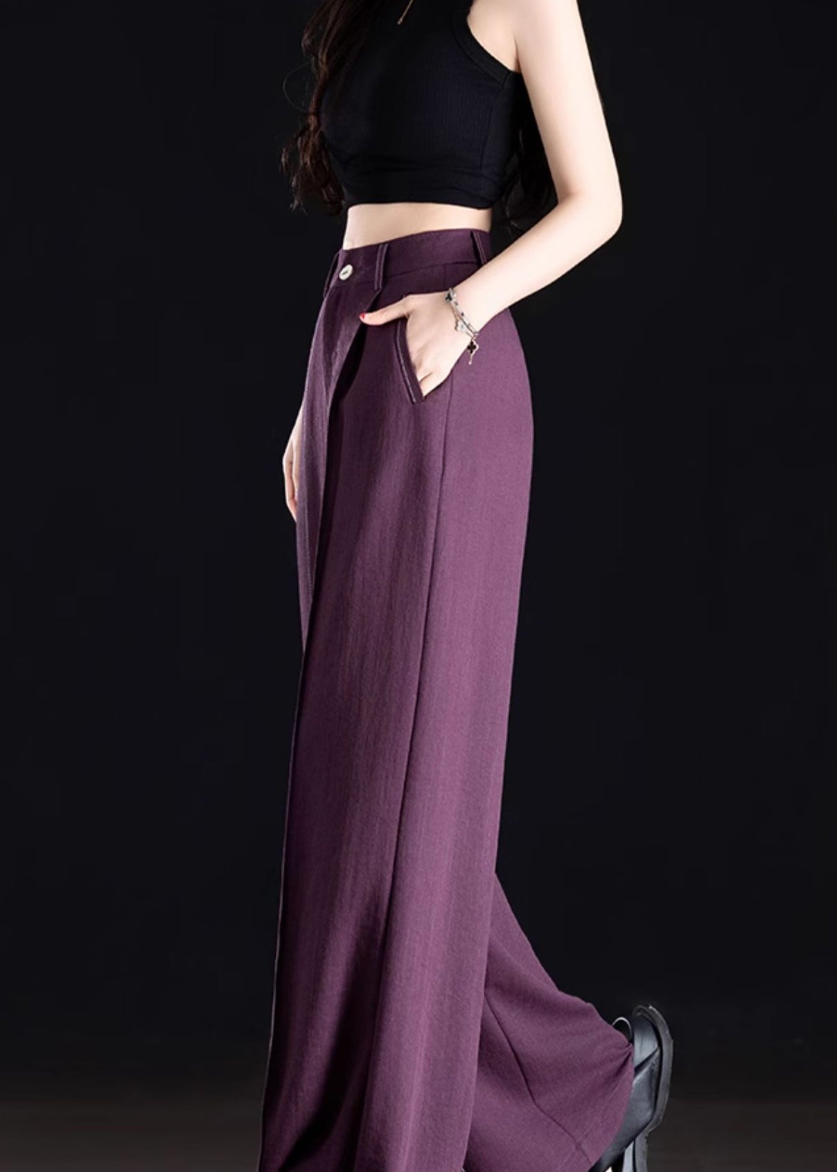 Classy Purple Pockets Patchwork Linen Straight Pants Spring