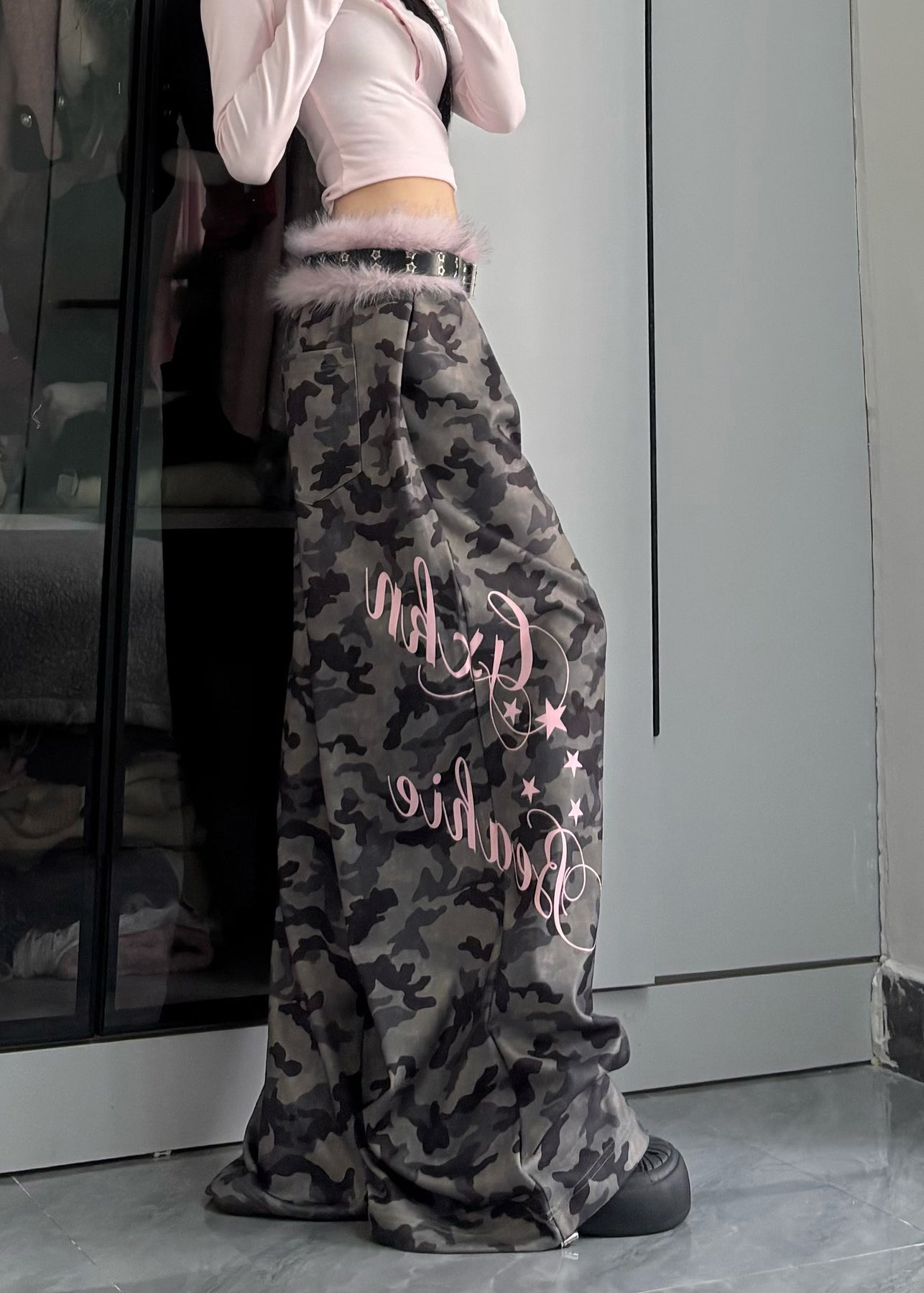 Modern Army Green Camouflage Letter Print Wide Leg Pants Spring