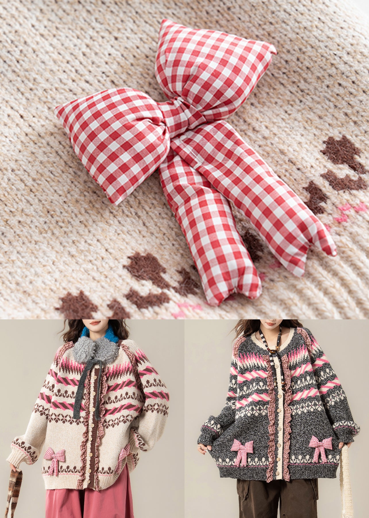Jacquard Dark Gray Ruffled Bow Patchwork Knit Coats Spring