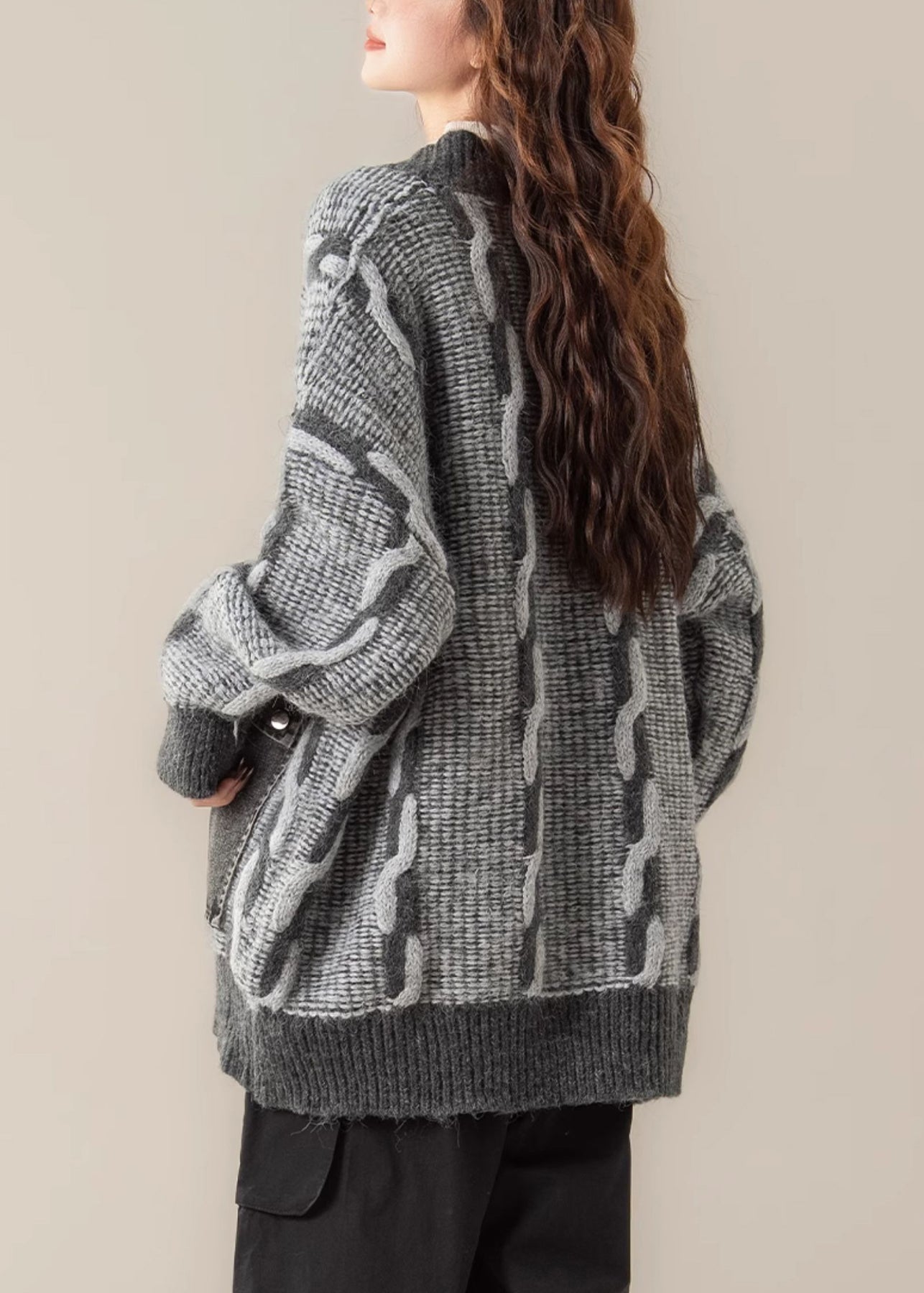 Plus Size Grey V Neck Pockets Patchwork Knit Coats Spring
