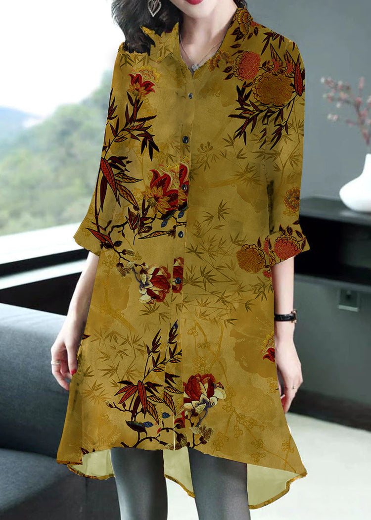 Yellow Print Silk Long Blouse Tops Peter Pan Collar Button Half Sleeve