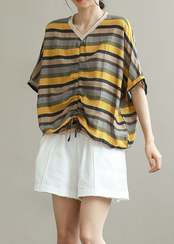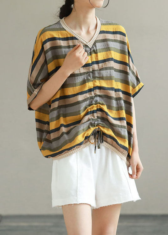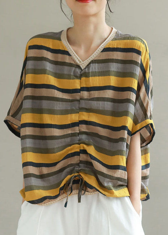 Yellow Striped Patchwork Cotton T Shirt Top V Neck Summer