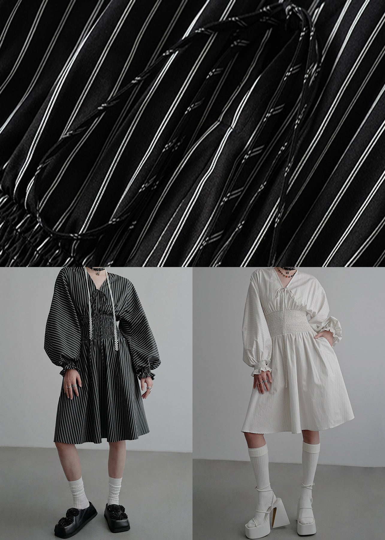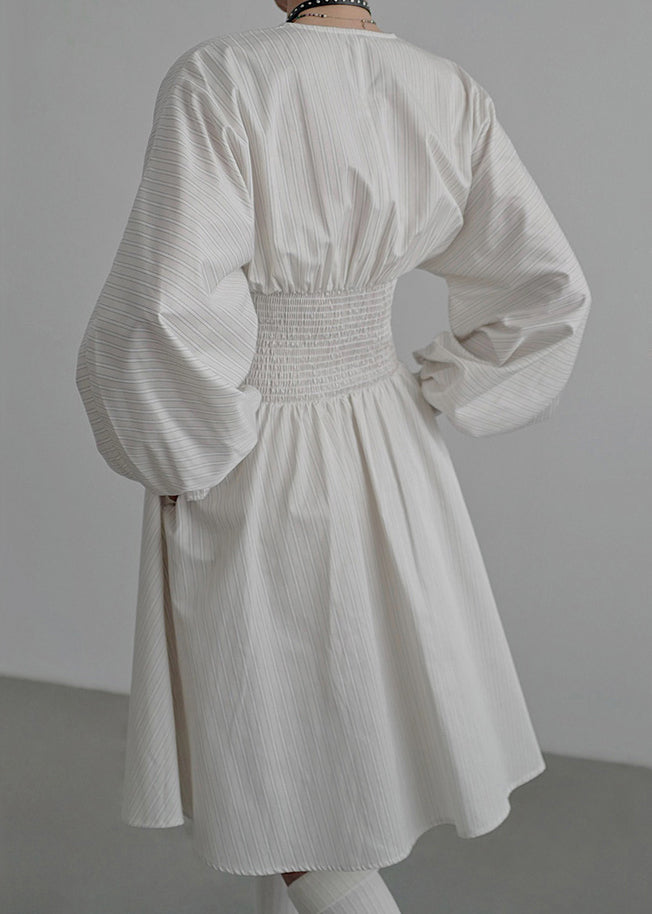 Beige Lace Up High Waist Cotton Dress V Neck Butterfly Sleeve