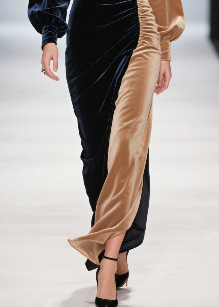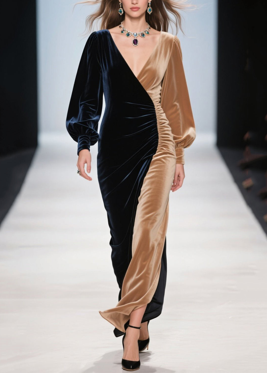 Women Colorblock Asymmetrical Patchwork Silk Velvet Dinner Dress Spring