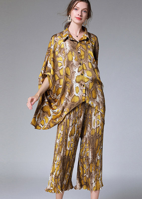 Natural Colorblock Peter Pan Collar Print Tops And Pants Chiffon Two Pieces Set Summer
