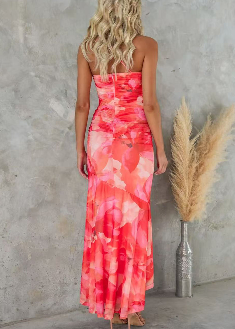Red Print Cotton Sleeveless Spaghetti Strap Dress Cold Shoulder