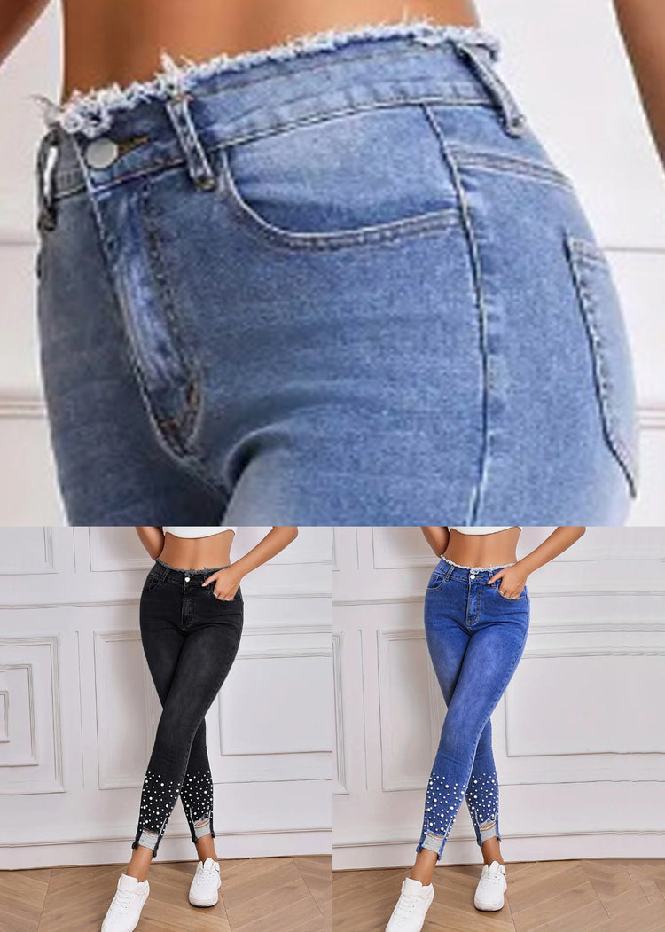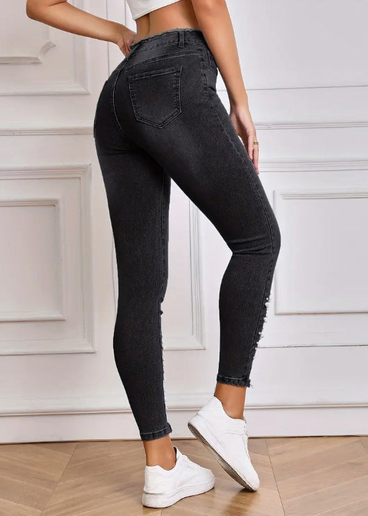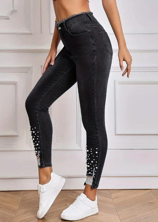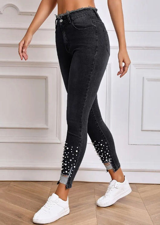 Stylish Black Pearl Hole Tunic Denim Pants Summer