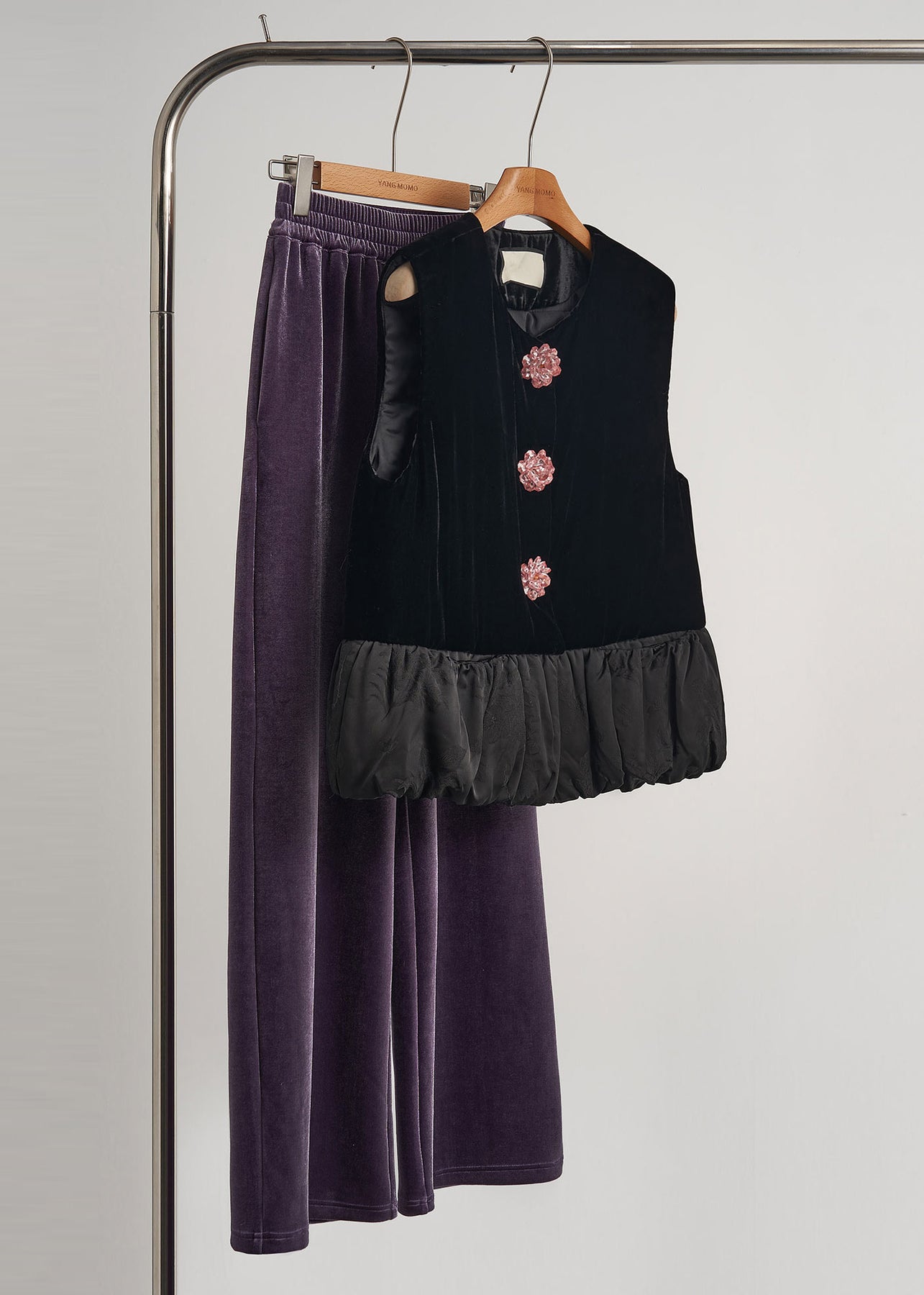 Modern Black Flower Decorated Patchwork Silk Velvet Vests Sleeveless
