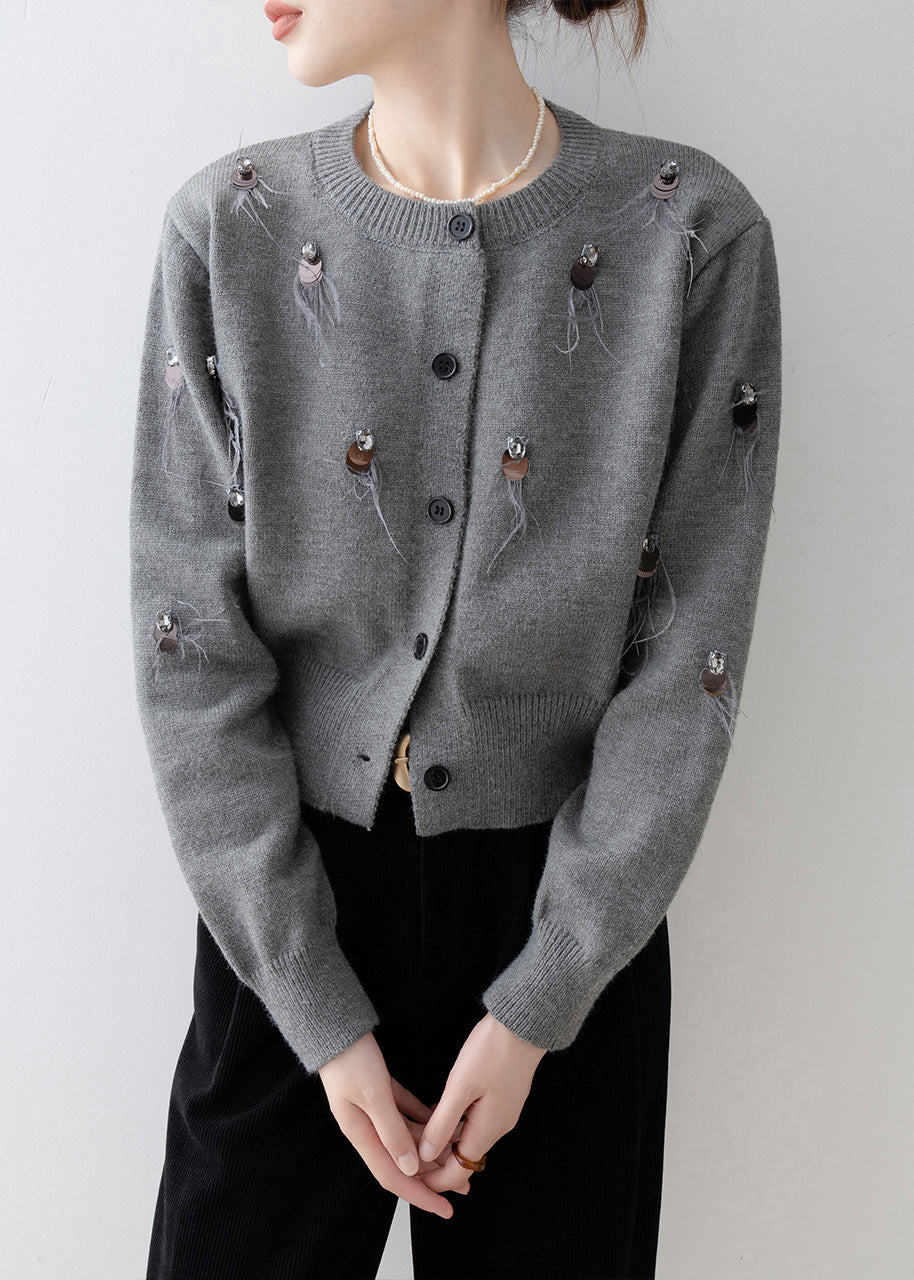 Boutique Grey O Neck Sequins Knit Cardigan Spring