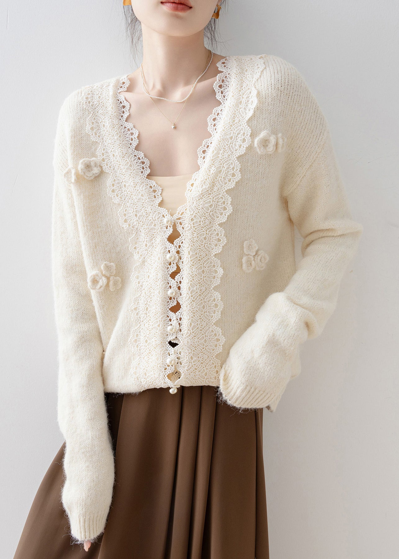 Chic Beige V Neck Lace Button Knit Cardigan Spring