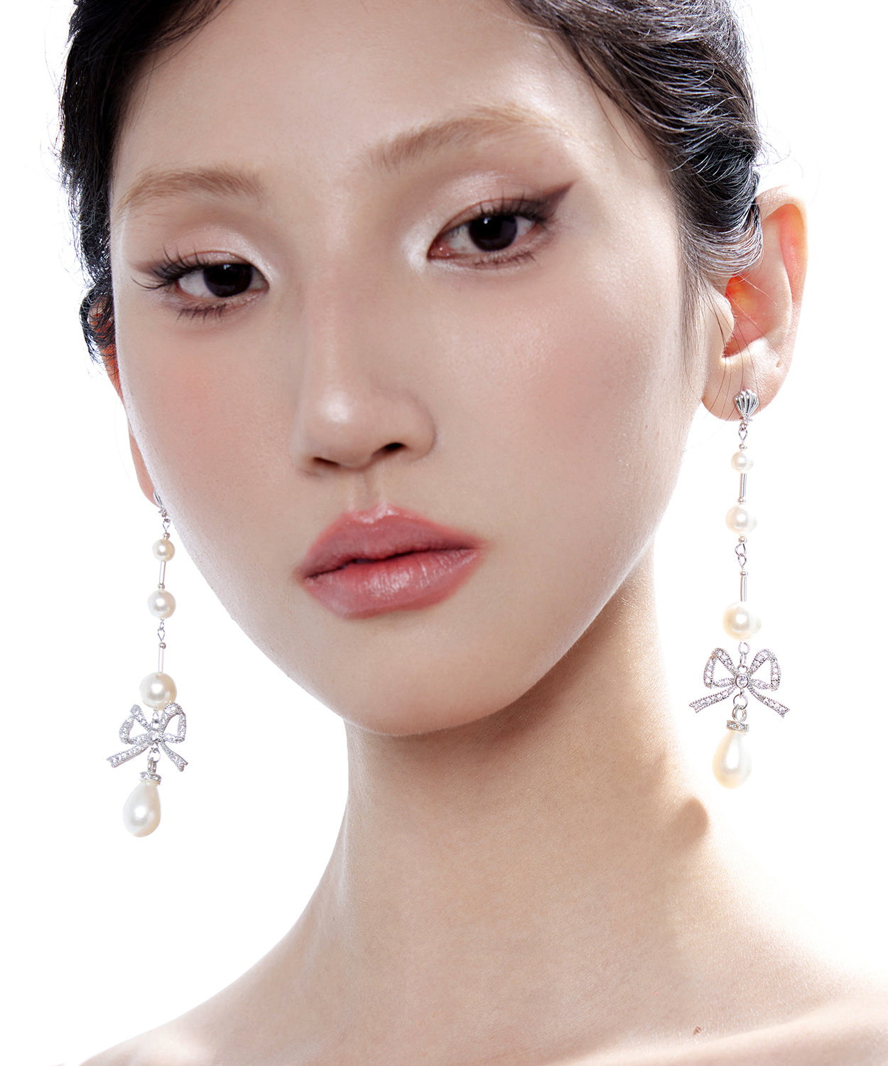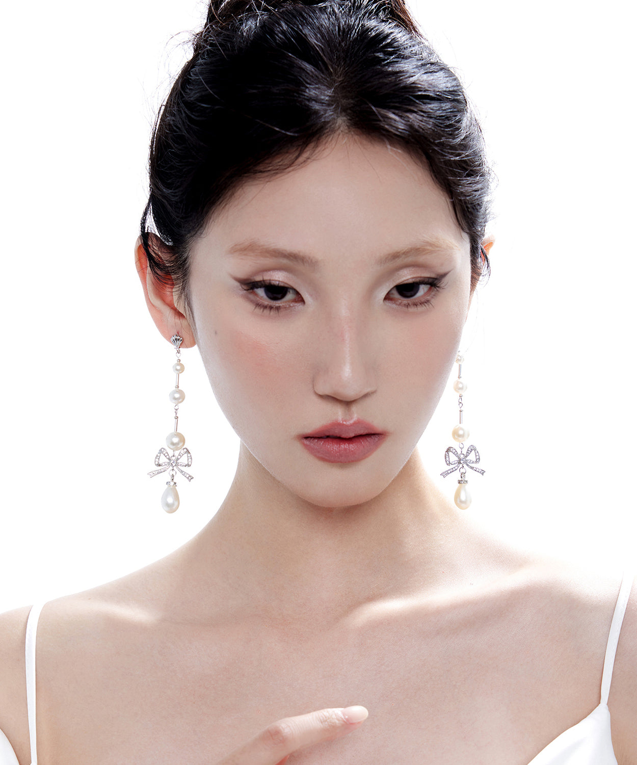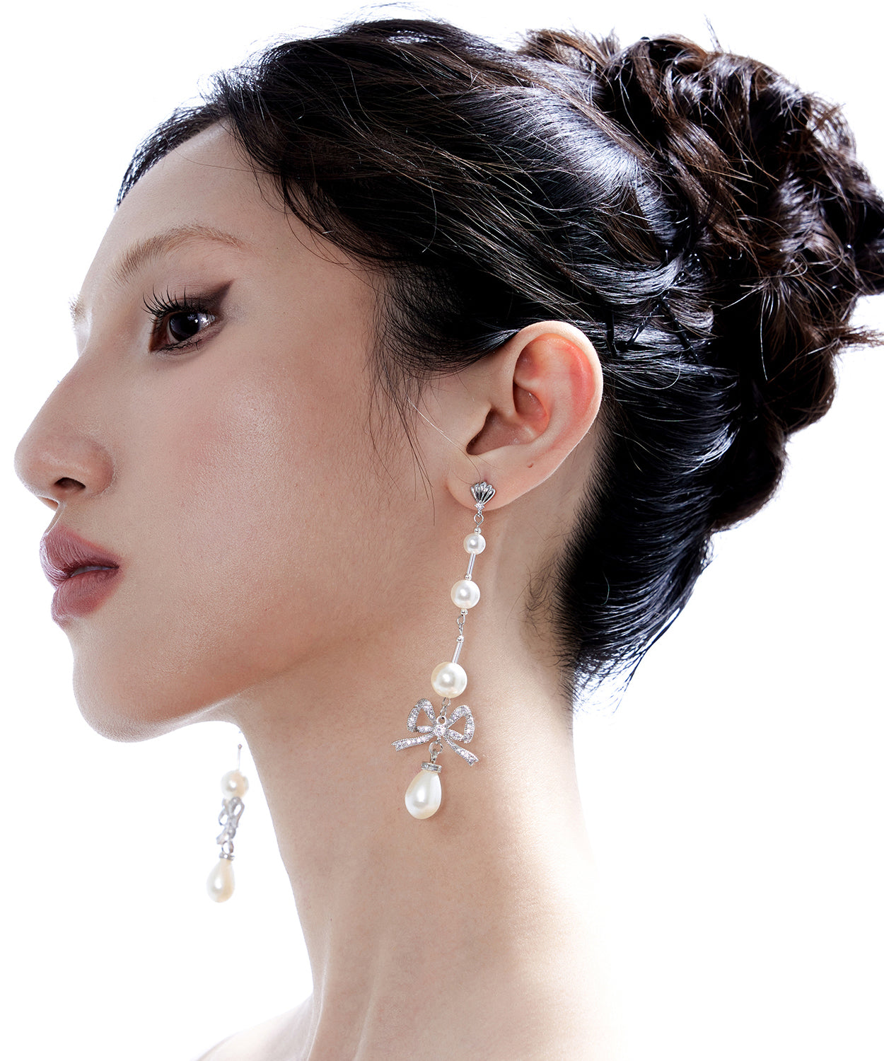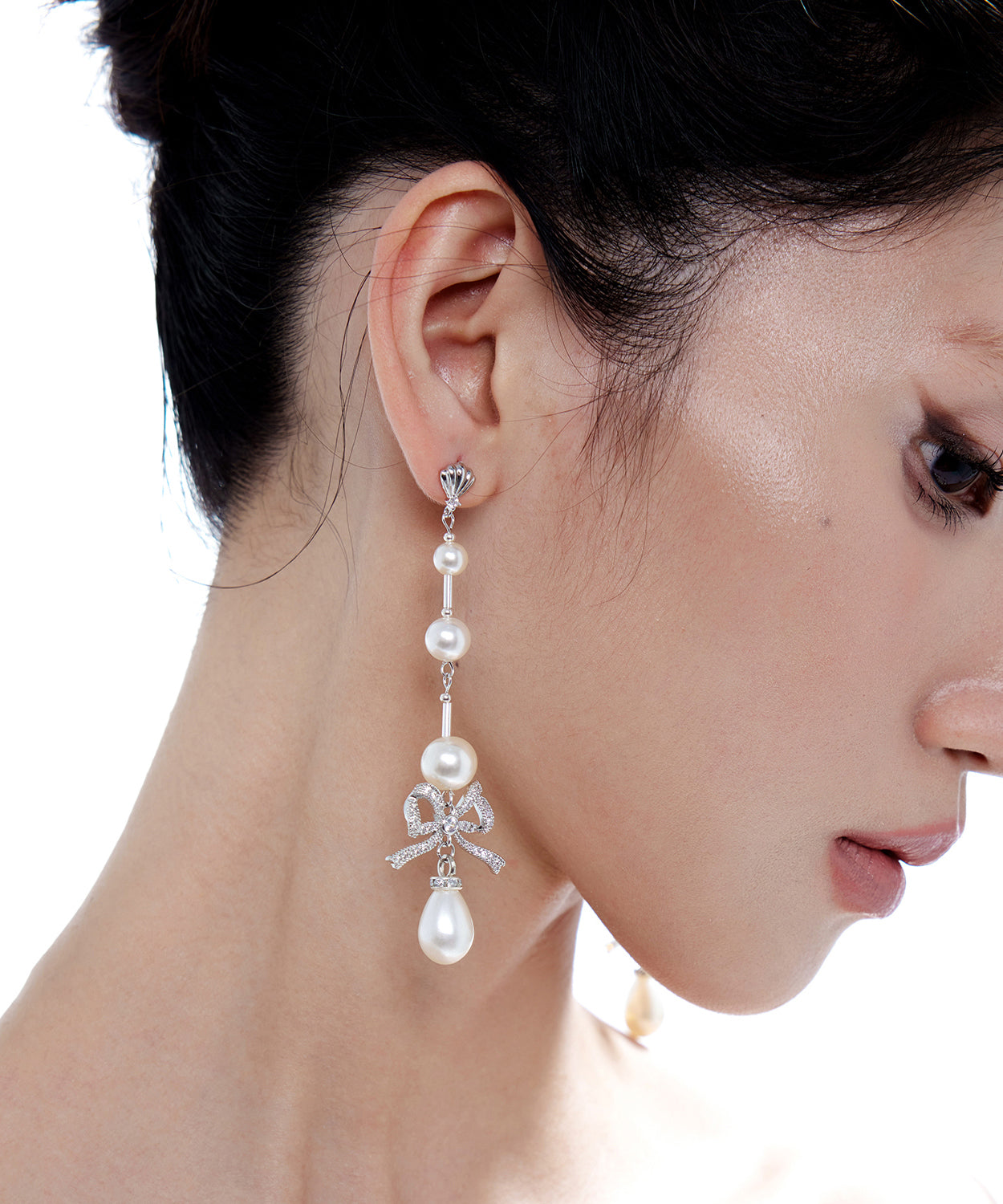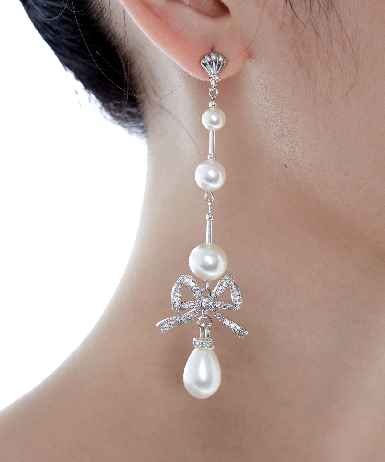 Elegant Pearl Bow Silver Long Drop Earrings Earrings