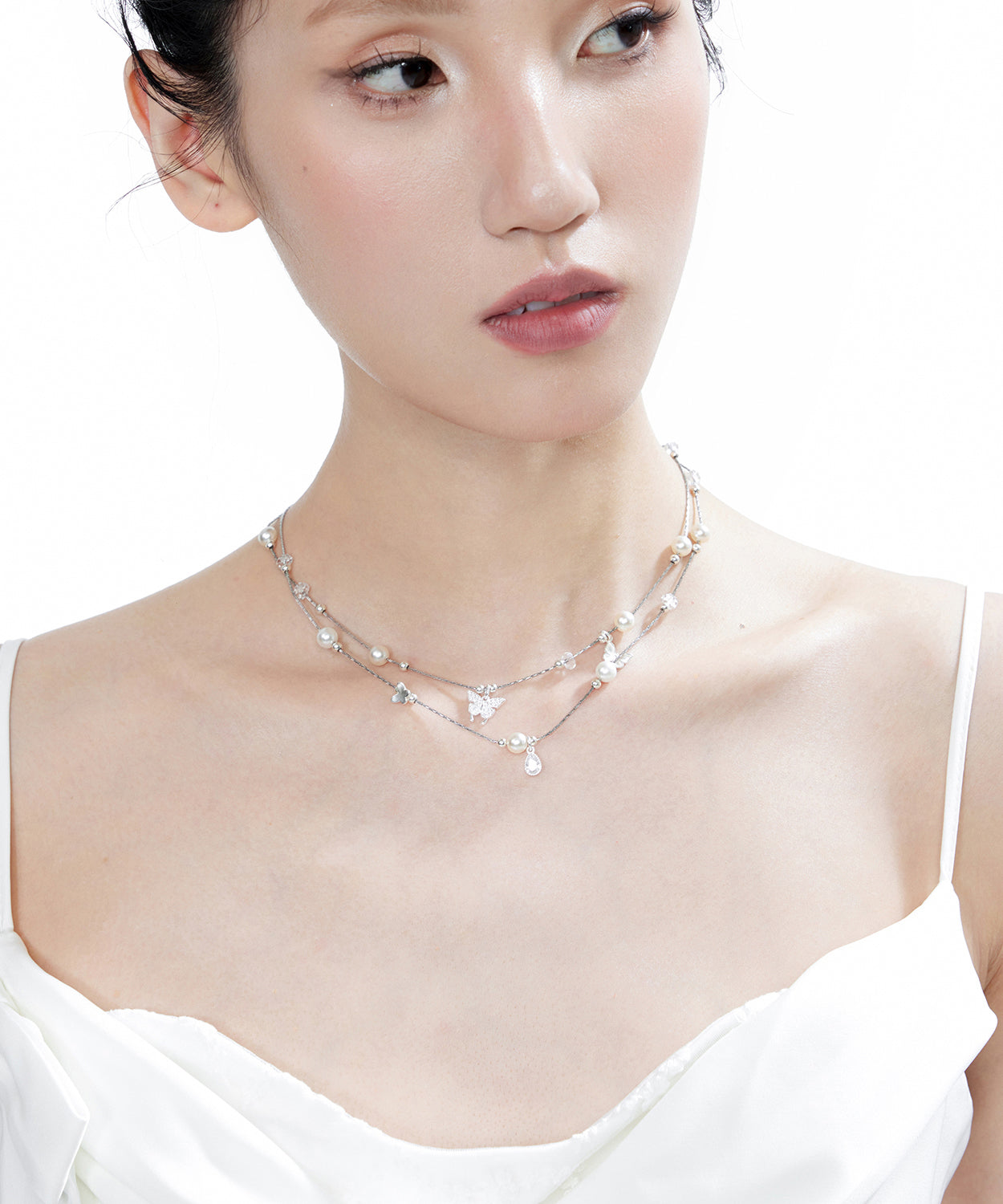 Original White Butterfly Crystal Pearl Double Layered Adjustable Silver Necklace