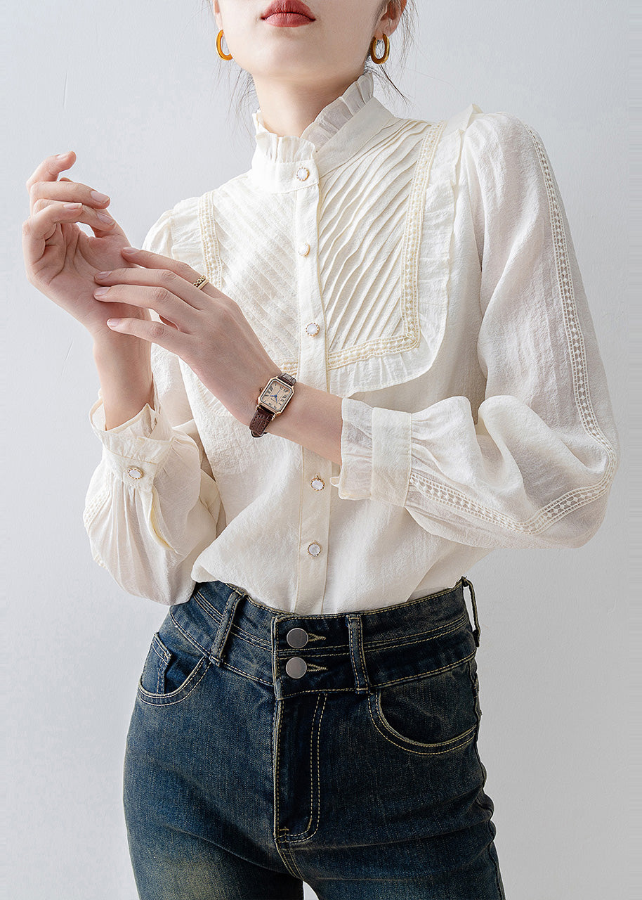 French White Ruffled Patchwork Wrinkled Chiffon Shirt Tops Spring