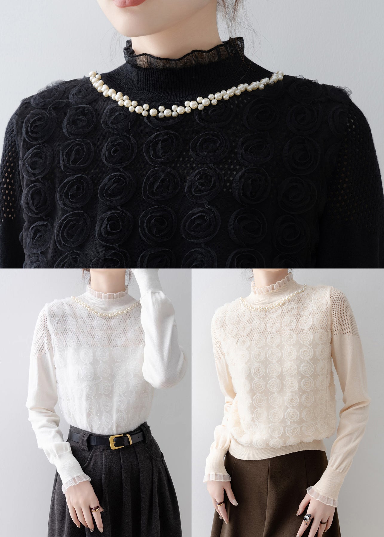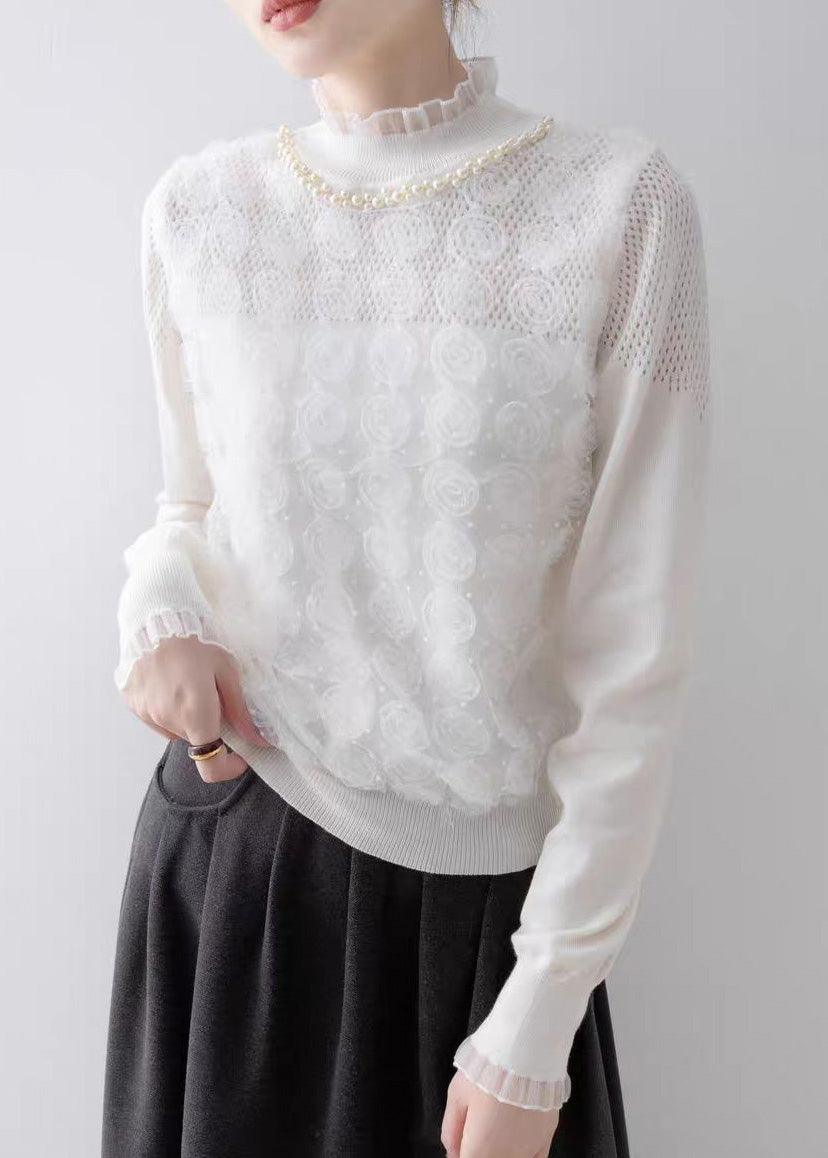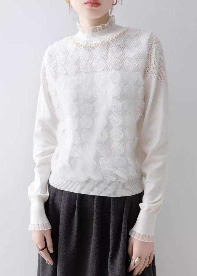 Modern White Ruffled Floral Knit Top Spring