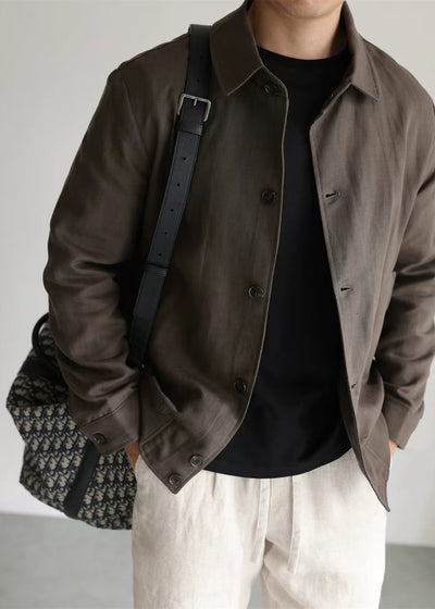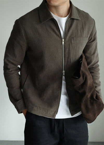 Casual Olive Green Zip Up Pockets Linen Mens Jackets Fall