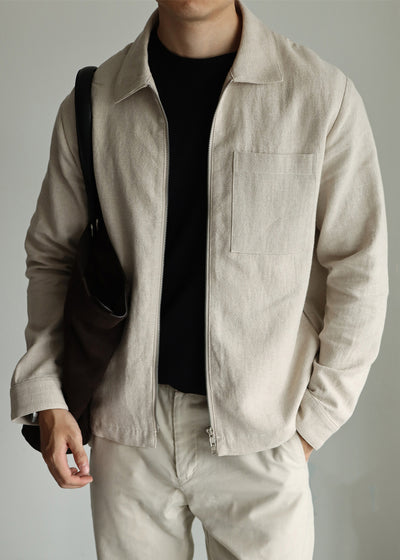 Light Khaki Drawstring Zip Up Solid Linen Mens Jackets Peter Pan Collar