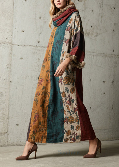 Vintage Colorblock Fuzzy Fur Fluffy Patchwork Cotton Maxi Dress Fall