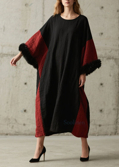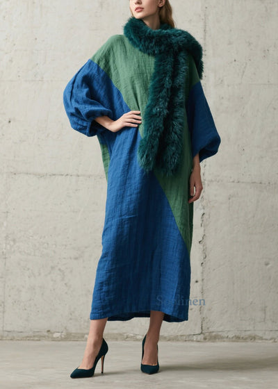 Loose Colorblock Patchwork Cotton Ankle Dress Batwing Sleeve