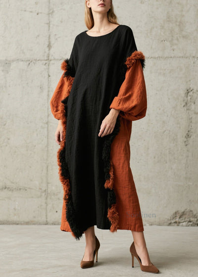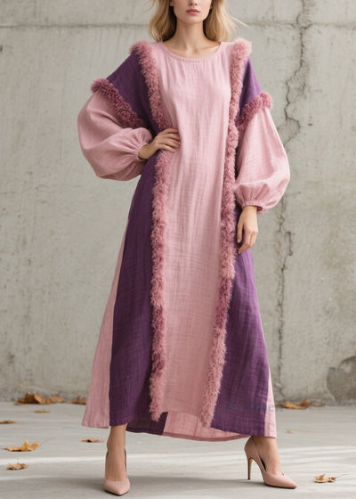 Casual Colorblock Fuzzy Fur Fluffy Patchwork Cotton Long Dresses Fall