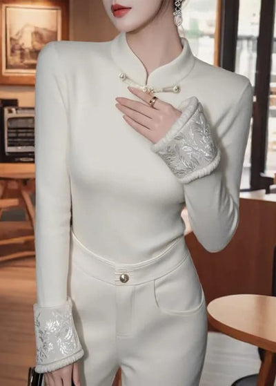 Chinese Style White Patchwork Warm Fleece Blouses Winter