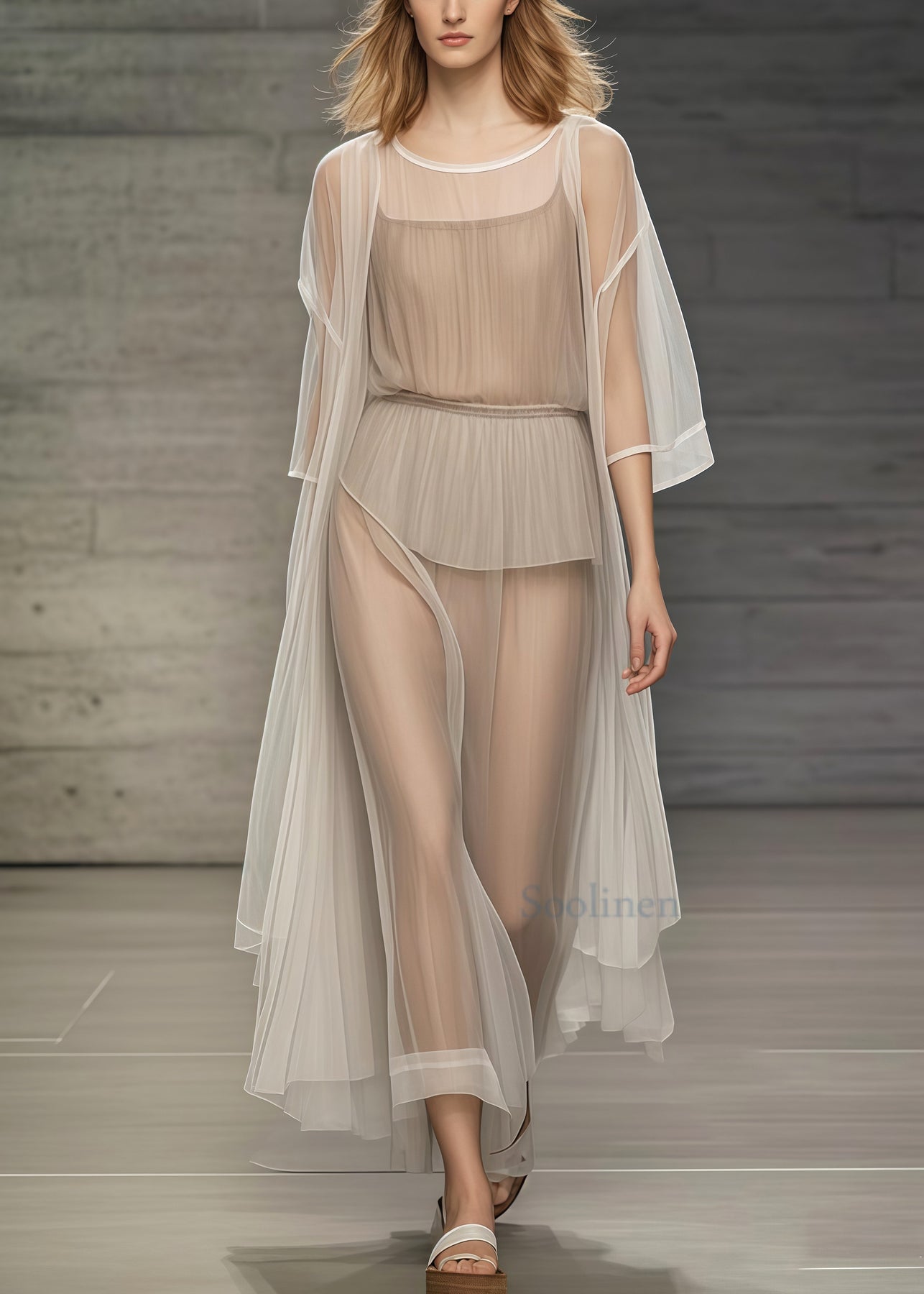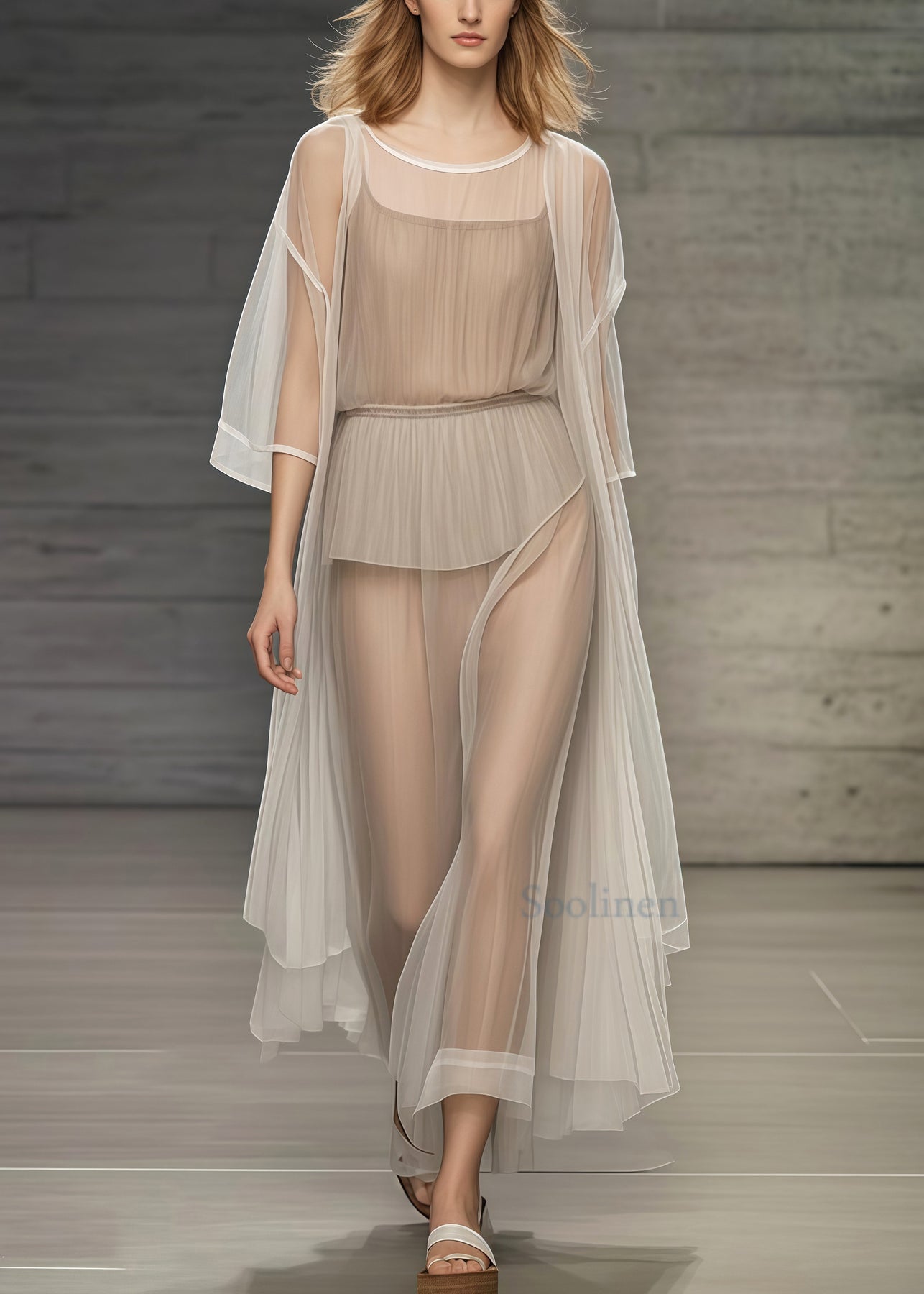 Fashion Khaki Oversized Sheer Tulle Beach Two Pieces Set Summer