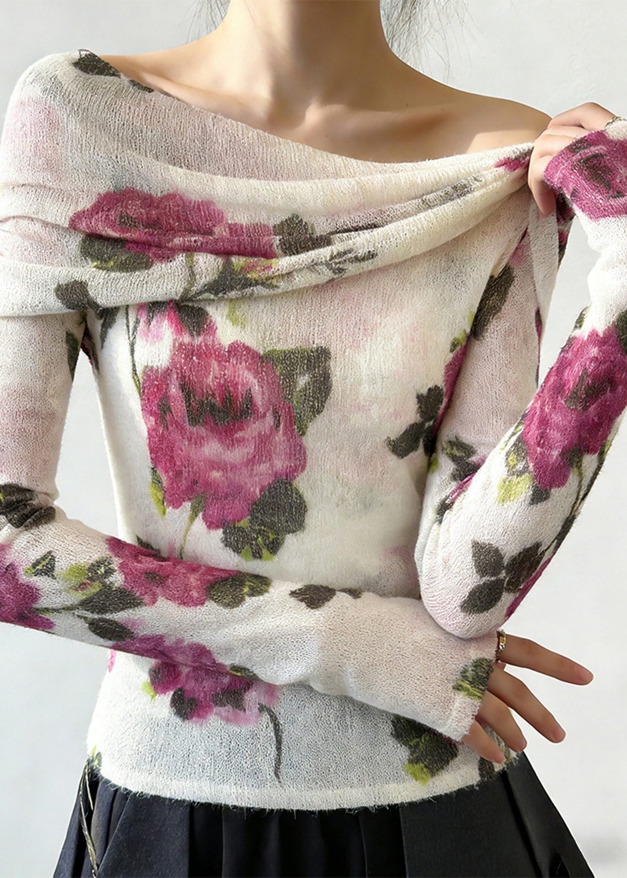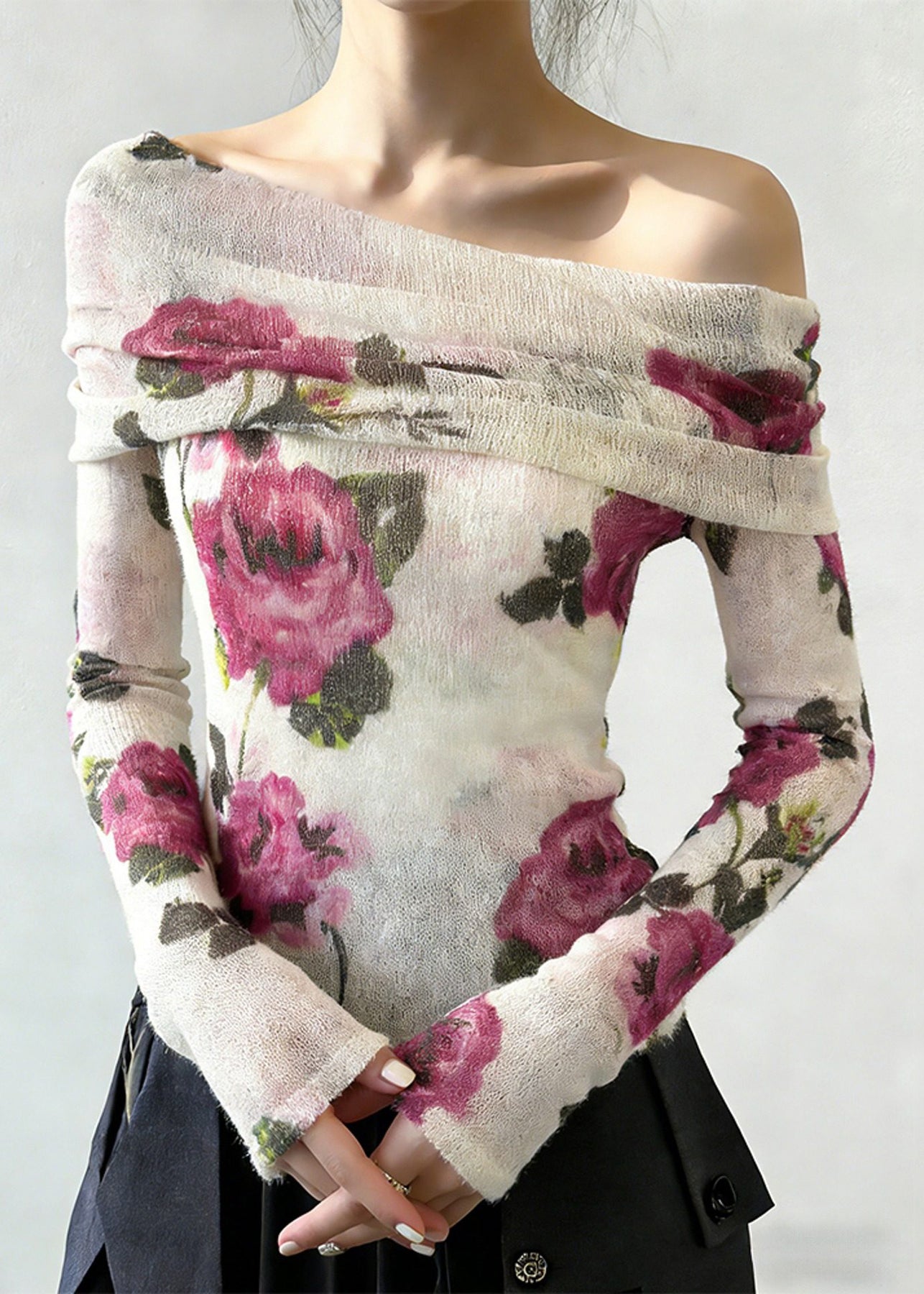 Fashion Slash Neck Print Knitting Cotton T Shirt Spring