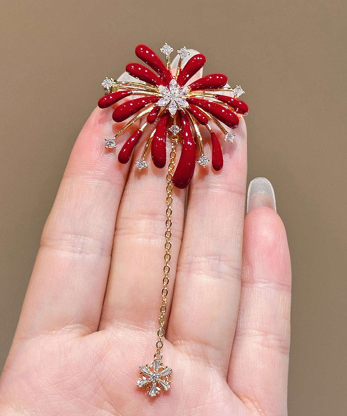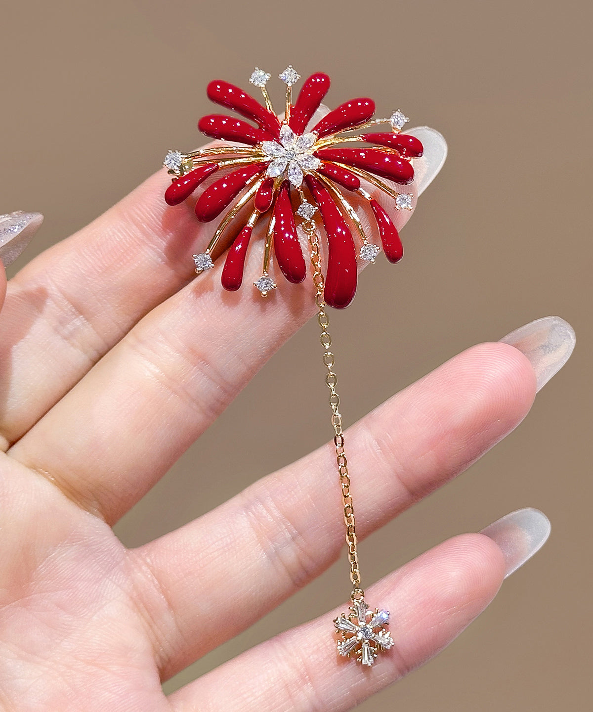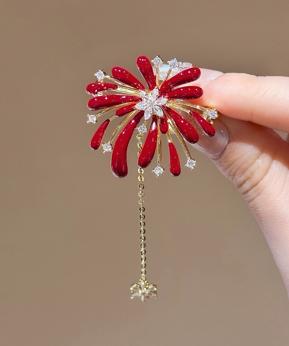 New Year Red Copper Overgild Zircon Fireworks Tassel Hairpin