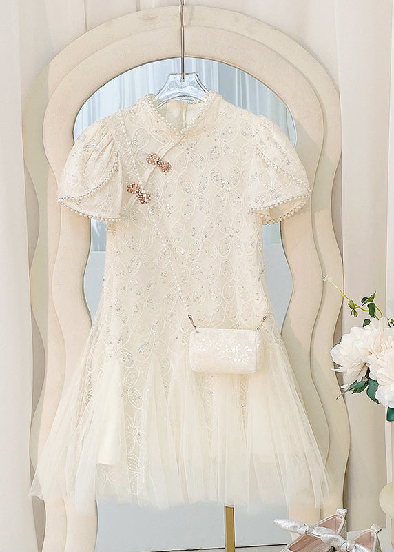 Art Beige Nail Bead Tulle Patchwork Kids Long Dress Short Sleeve