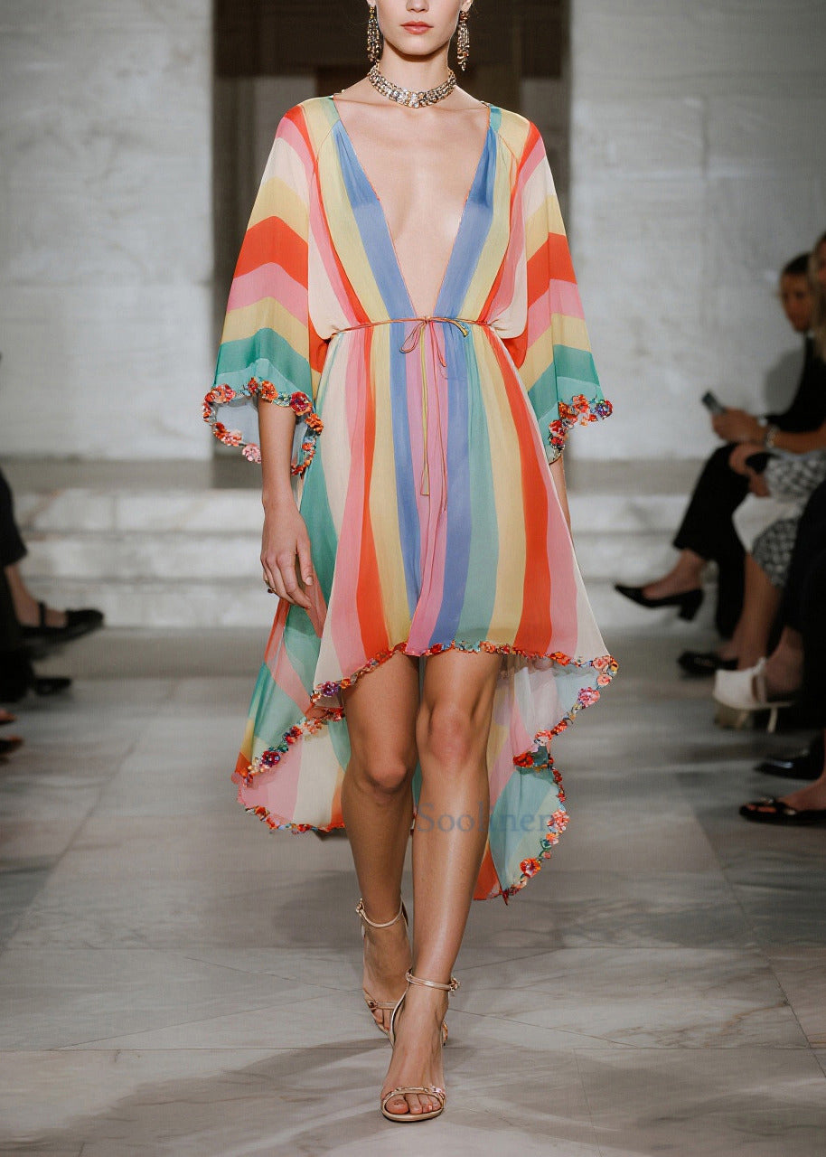 Rainbow Striped Chiffon Beach Dress Ruffled Low High Design Summer