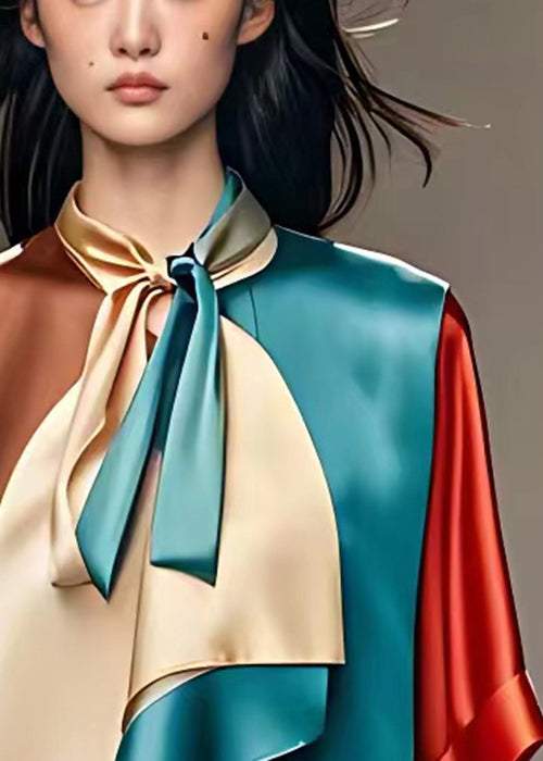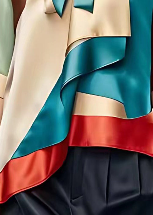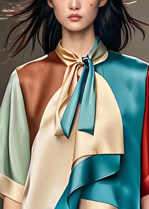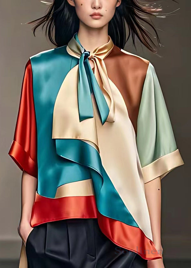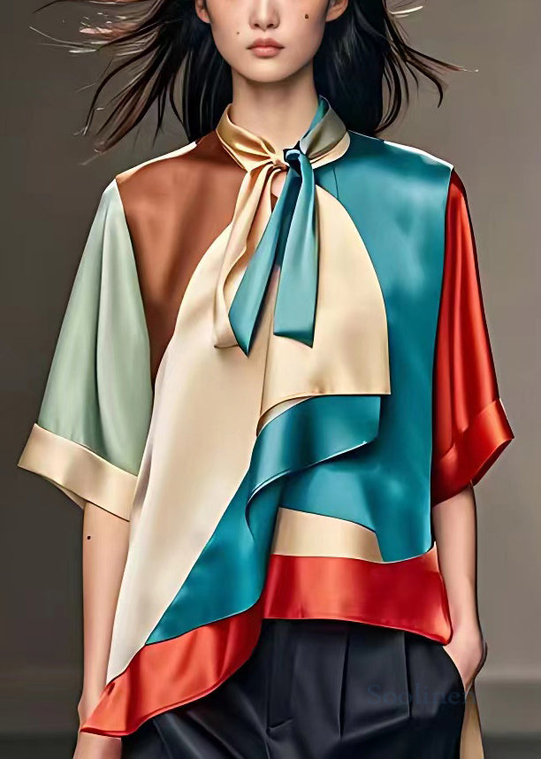 Art Asymmetrical Scarf Collar Patchwork Silk Shirt Half Sleeve