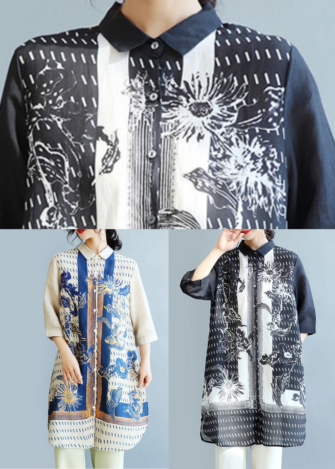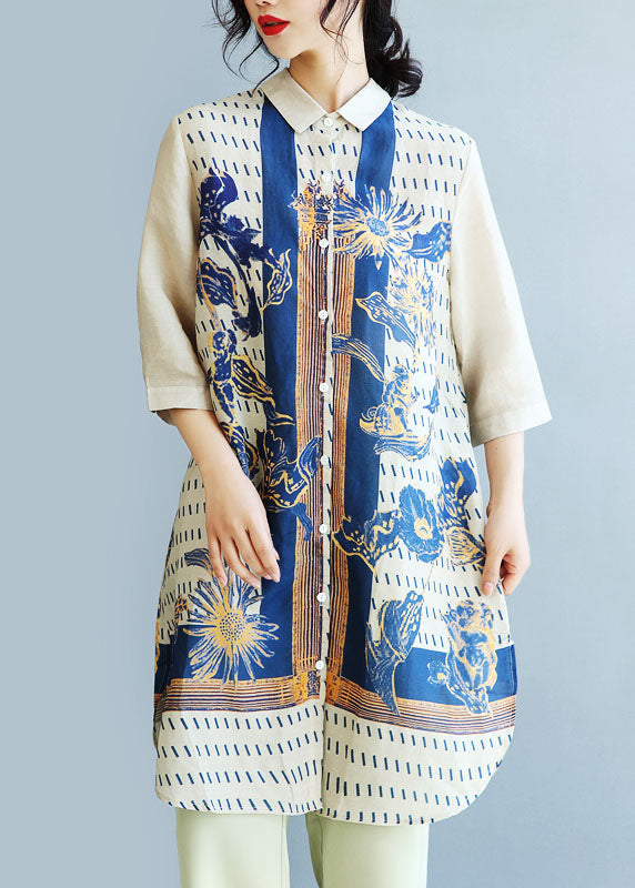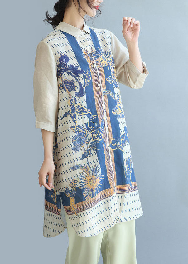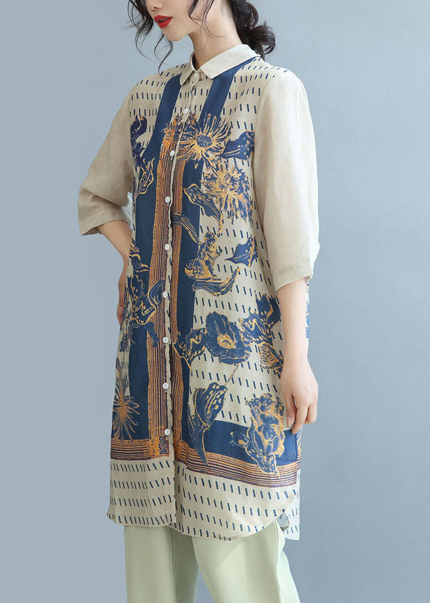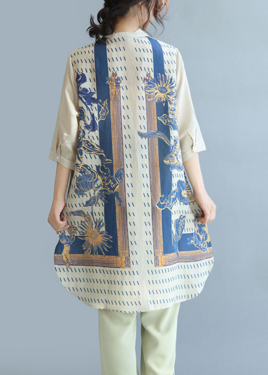 Beige Print Linen Long Shirt Top Side Open Half Sleeve
