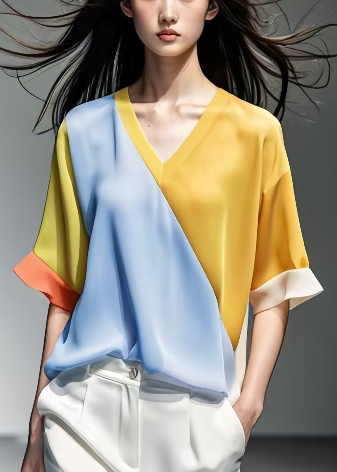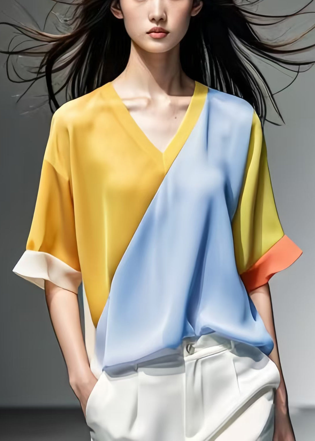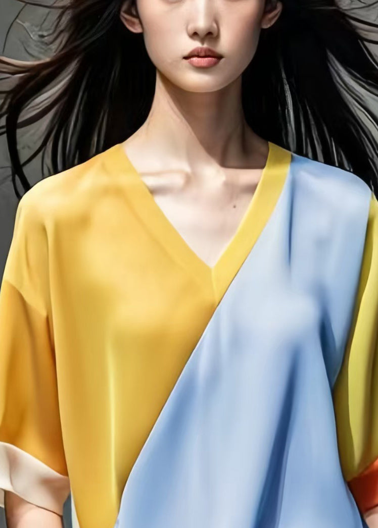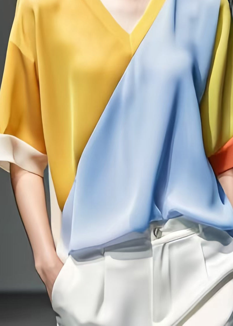 New Yellow V Neck Patchwork silk Tops Half Sleeve