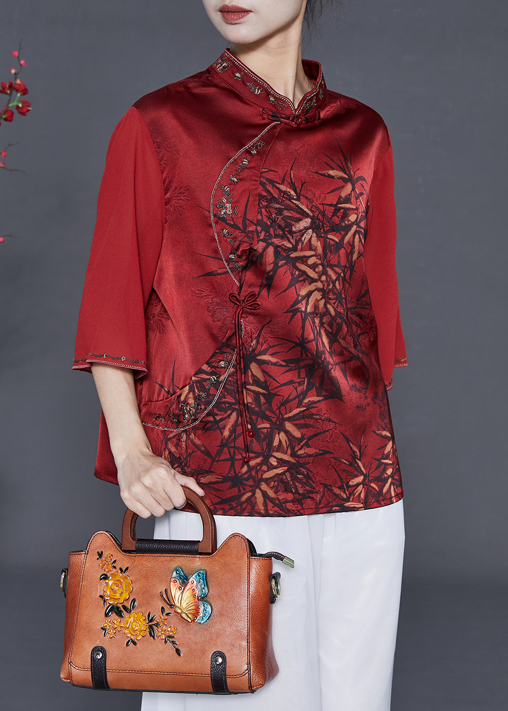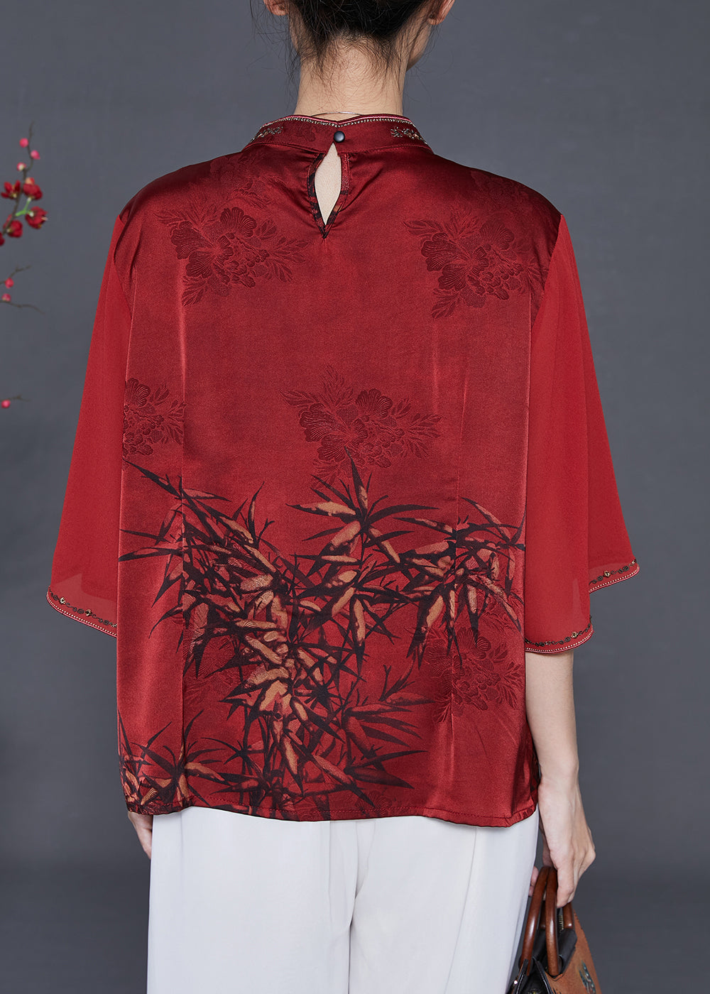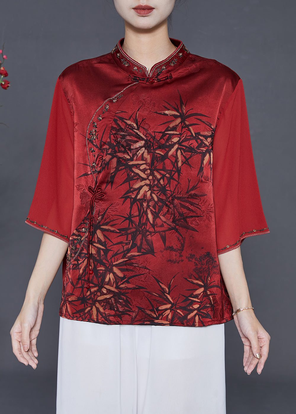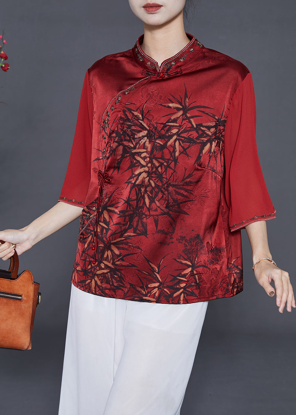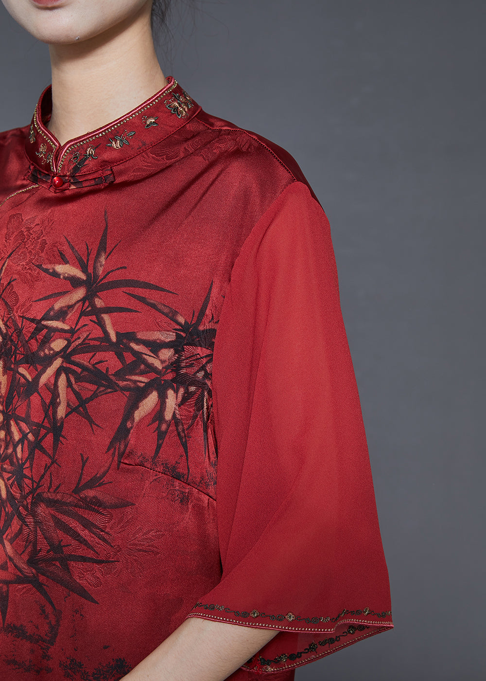 Red Print Silk Oriental Shirt Tasseled Embroidered Summer