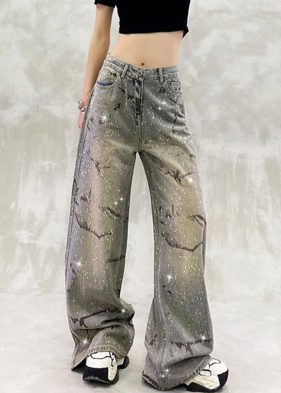 Autumn New High Waisted Zircon Denim Straight Leg Pants
