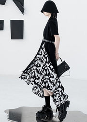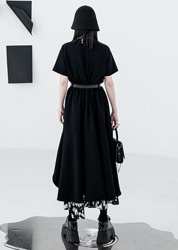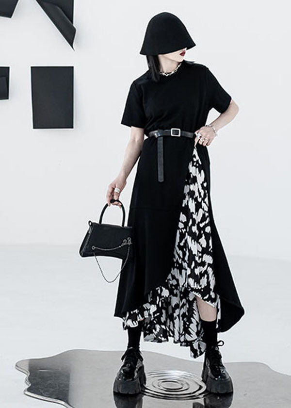French Black O Neck Asymmetrical Patchwork Print Cotton Long Dress Short Sleeve