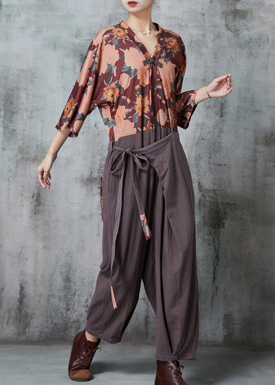 Apricot Print Patchwork Linen Two Piece Set Outfits Wrinkle Spring