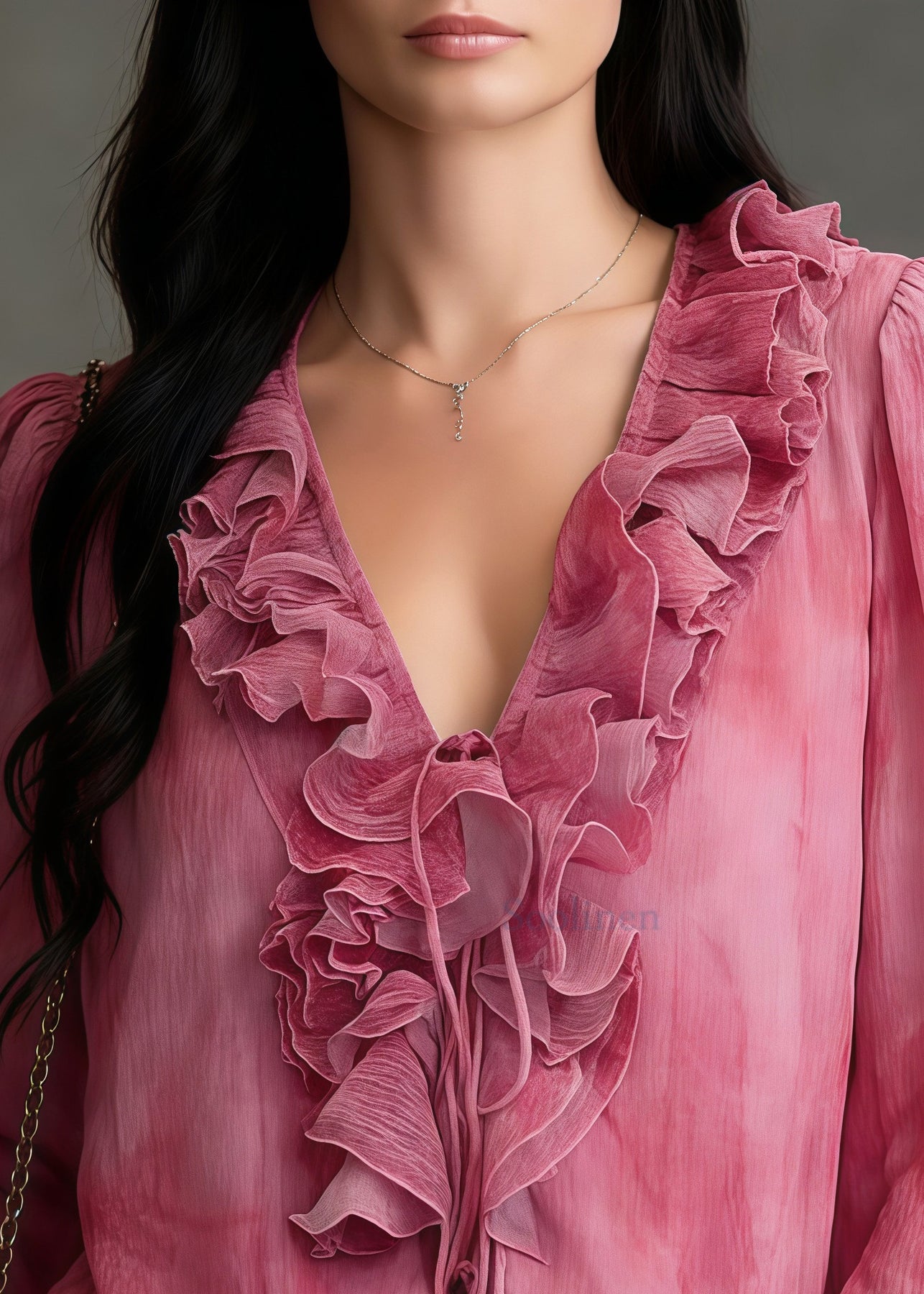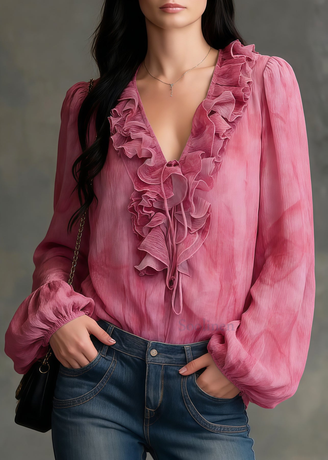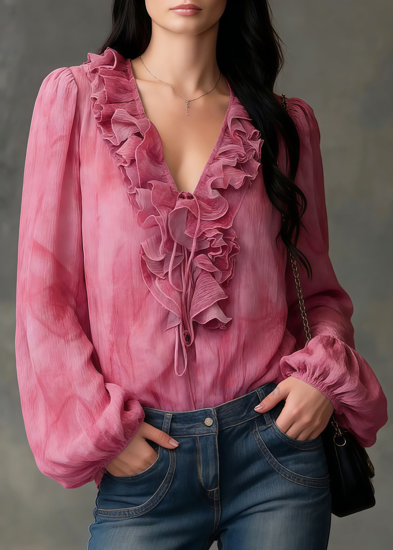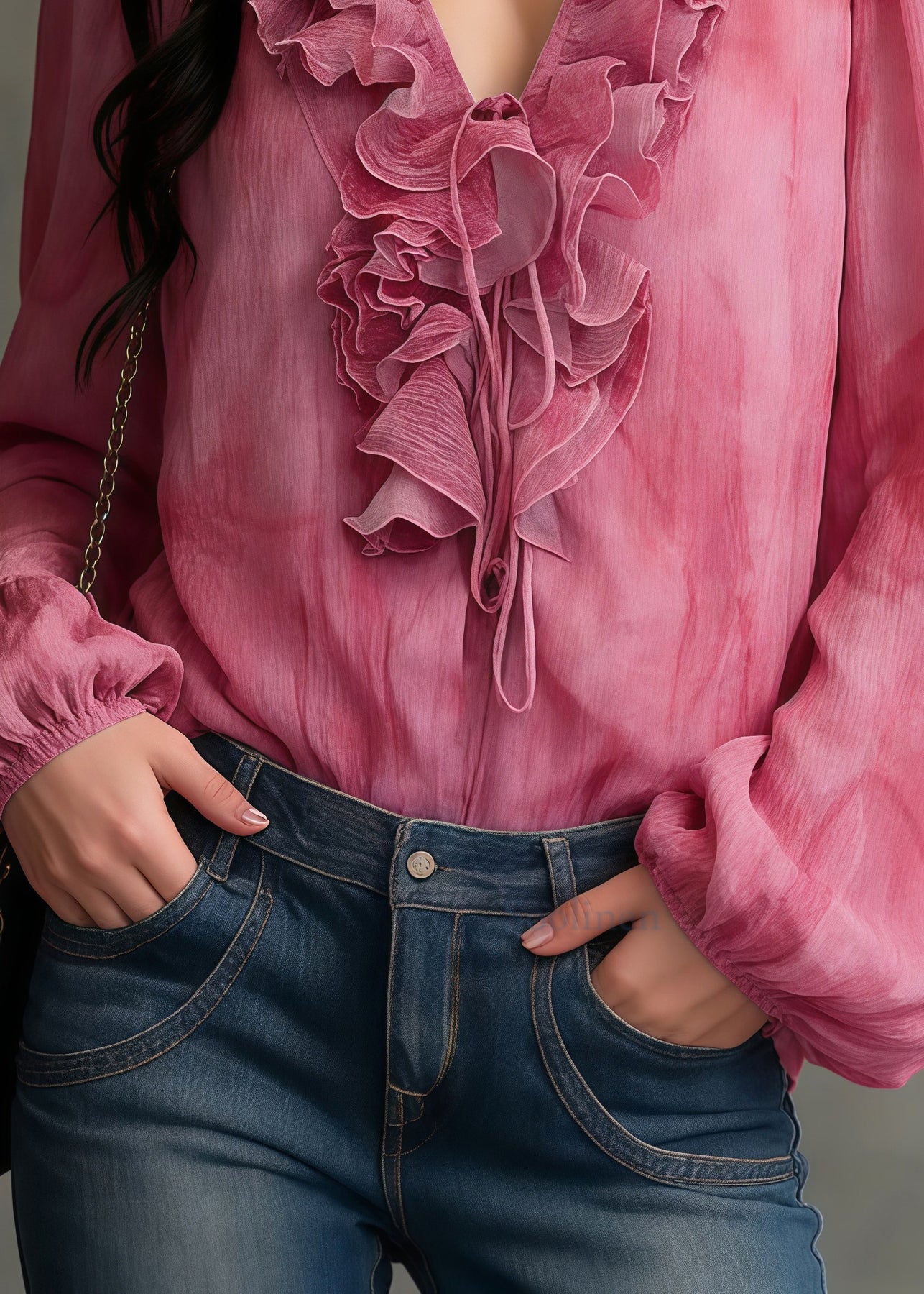French Pink Ruffled Tie Dye Chiffon Shirt Top Spring