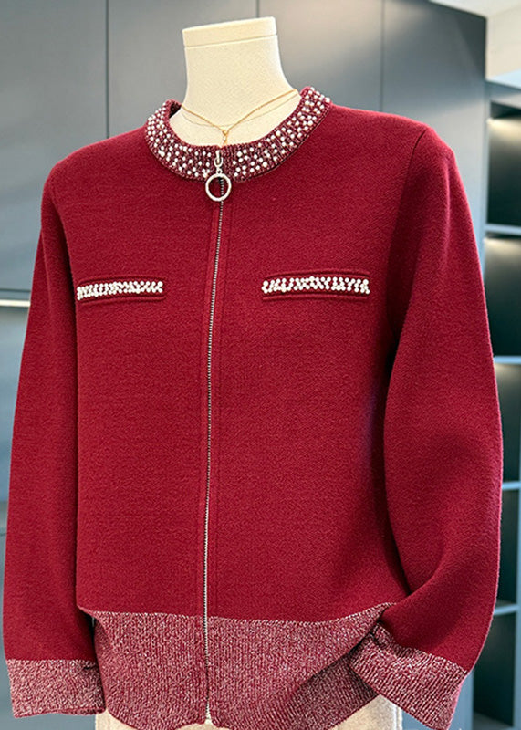 Loose Camel Zippered Nail Bead Cotton Knit Coat Fall