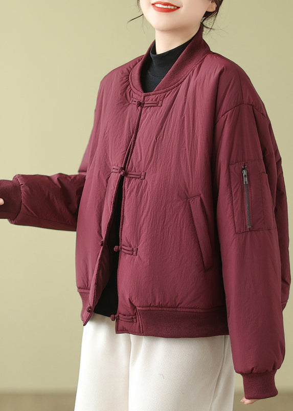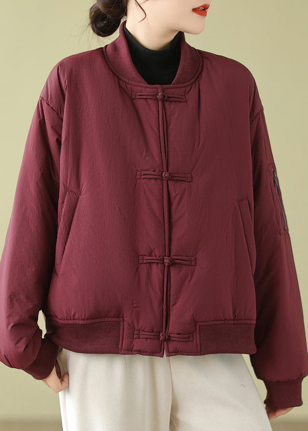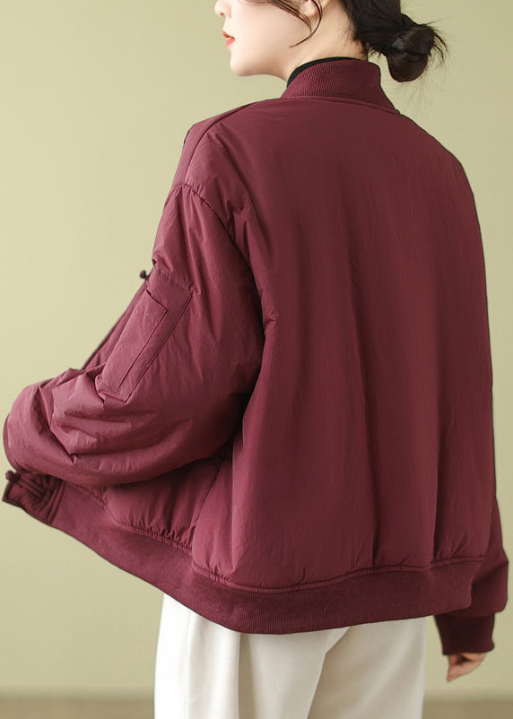 Wine Red Pockets Patchwork Cotton Filled Parka Stand Collar Winter